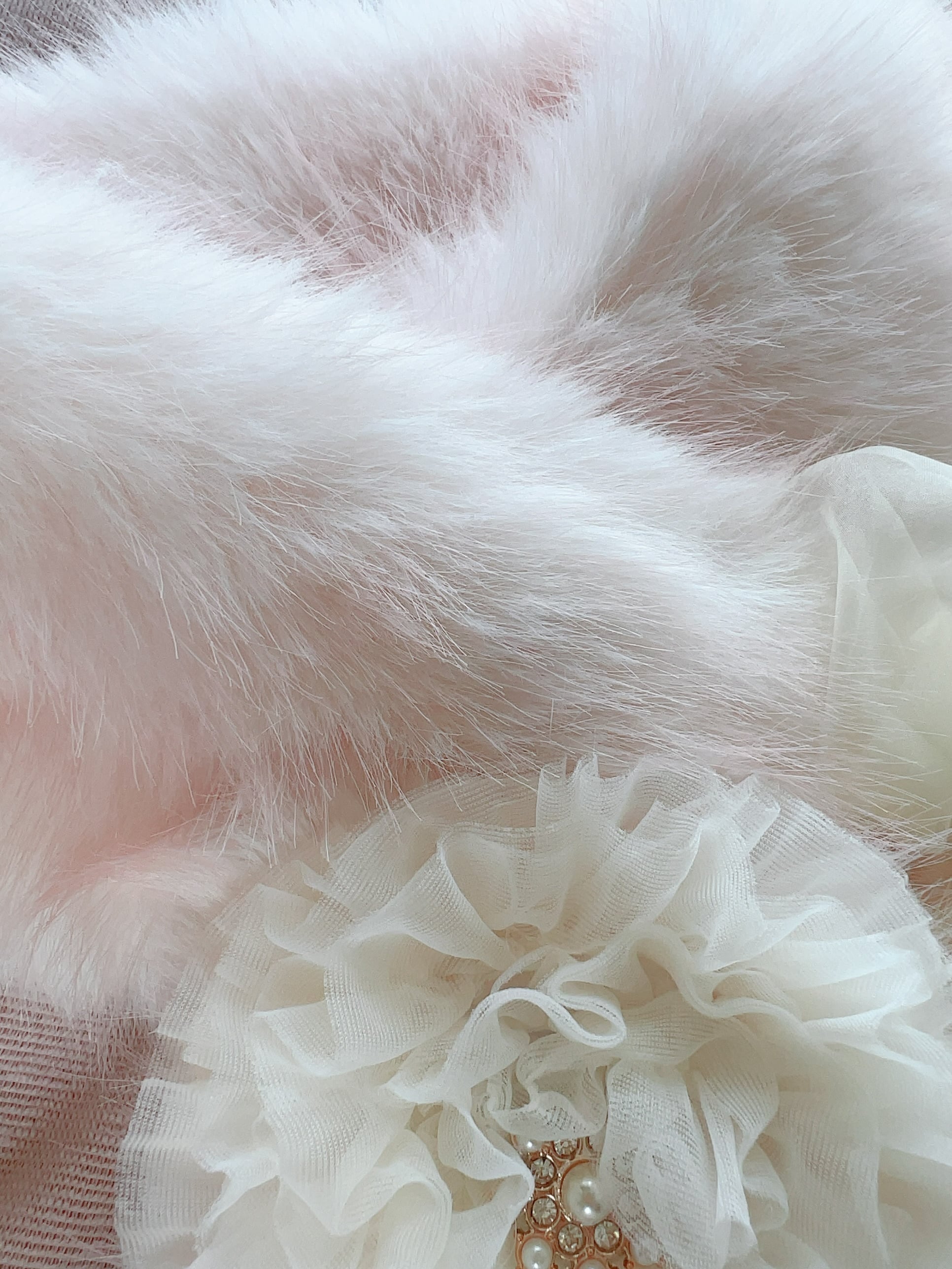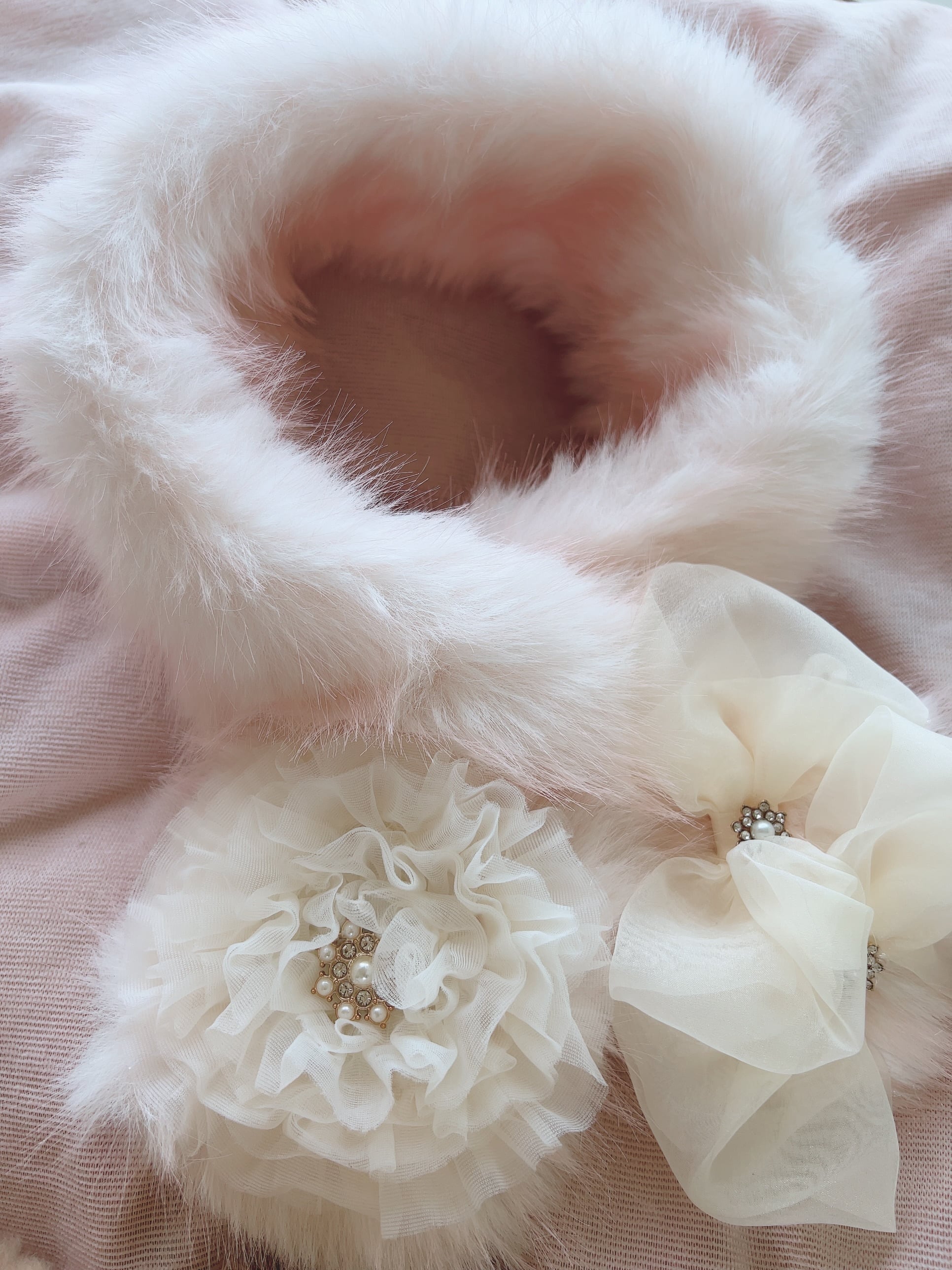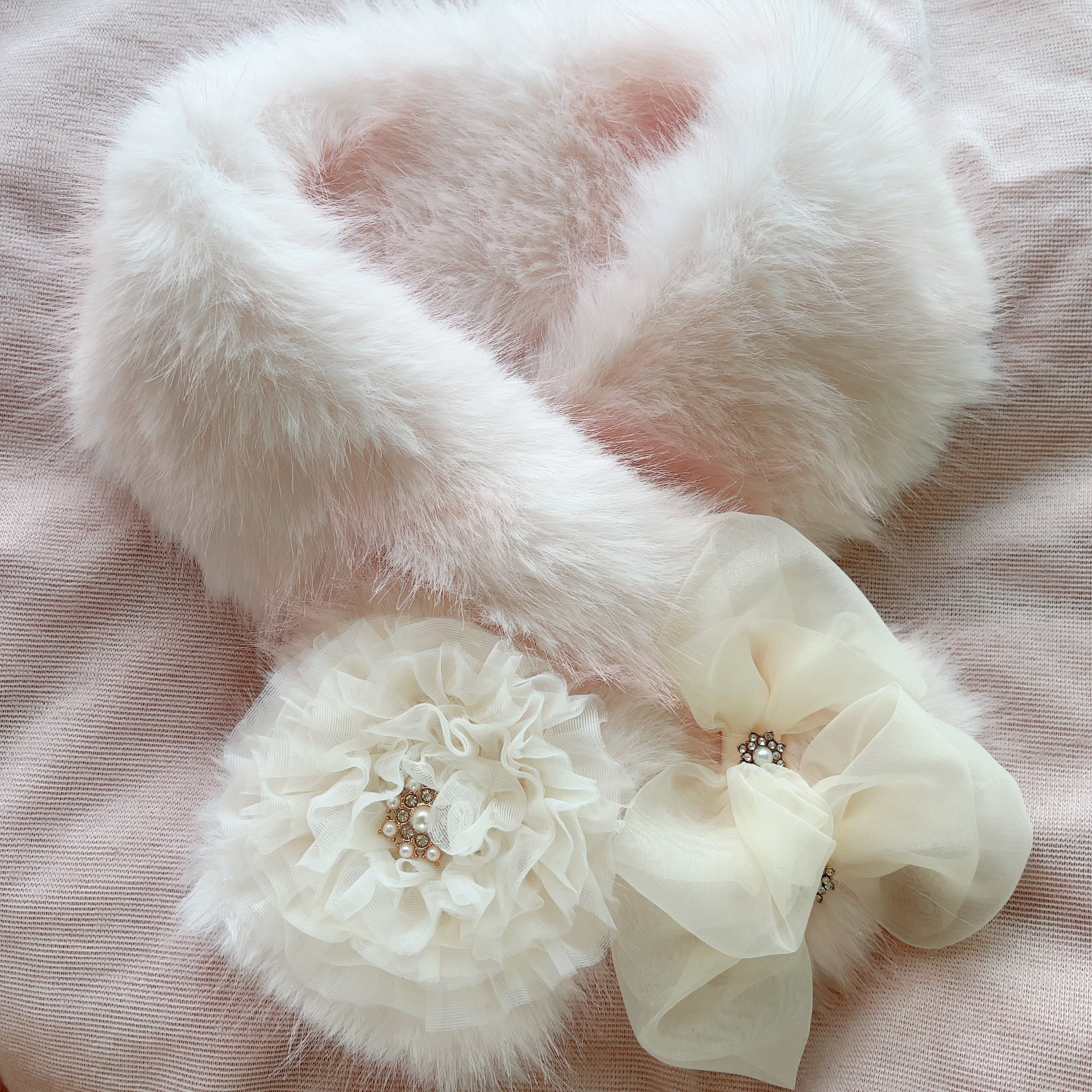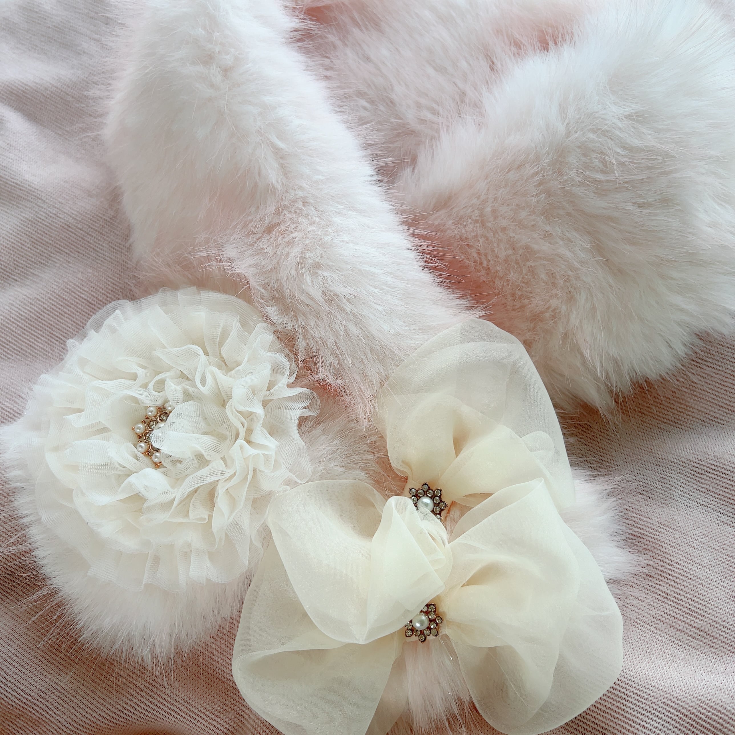 上質リッチなファーとパールのマットな光沢、華奢だけど存在感のあるお花が