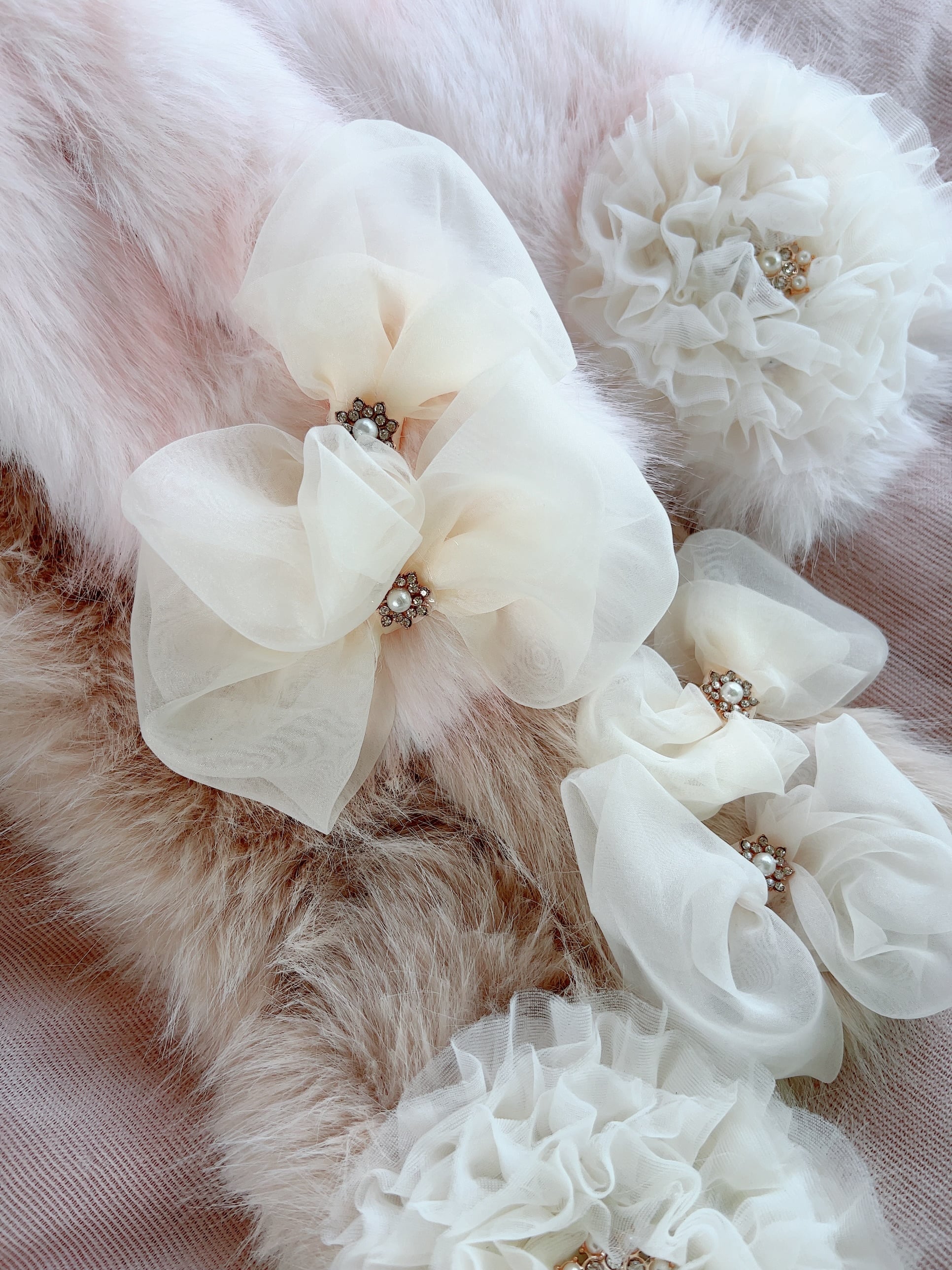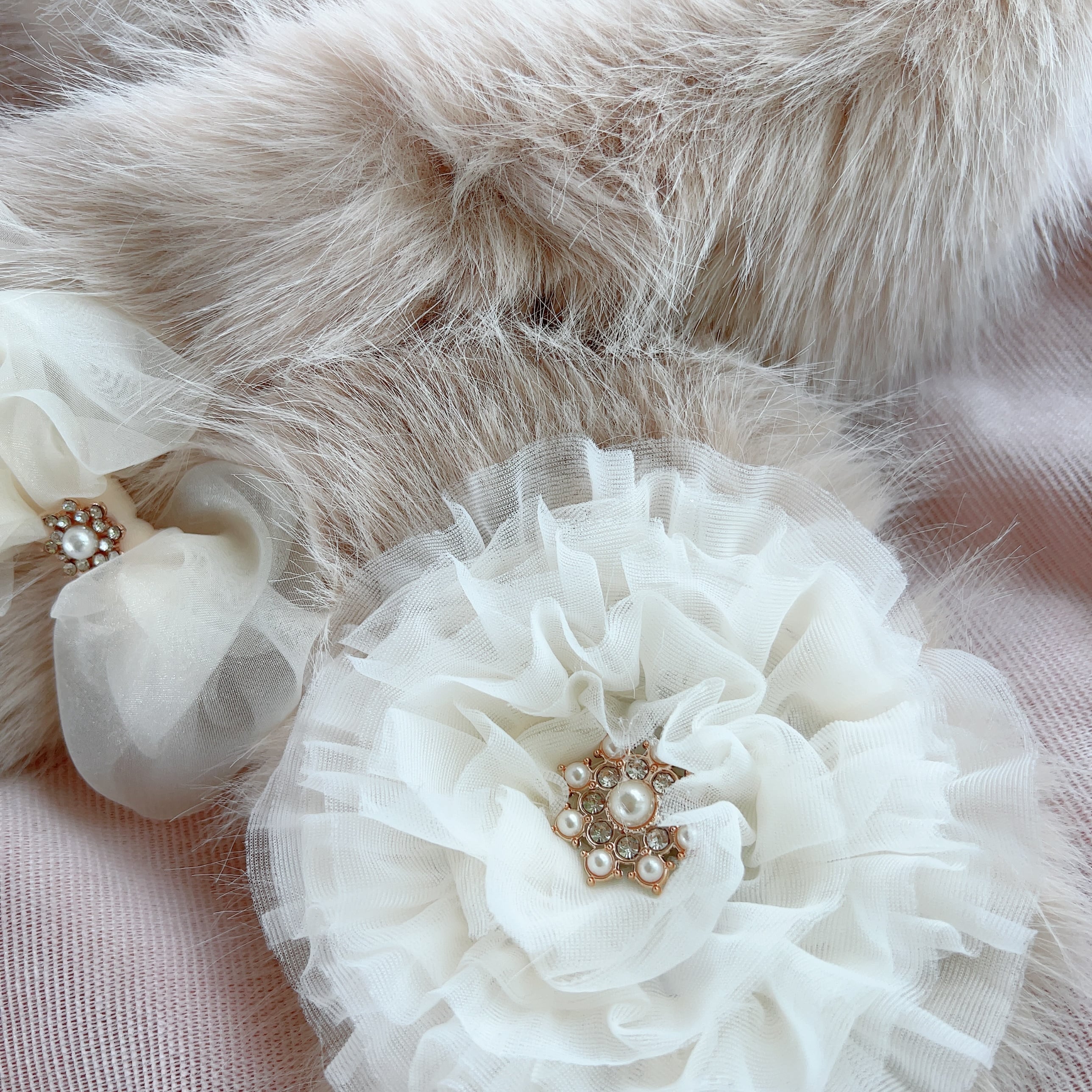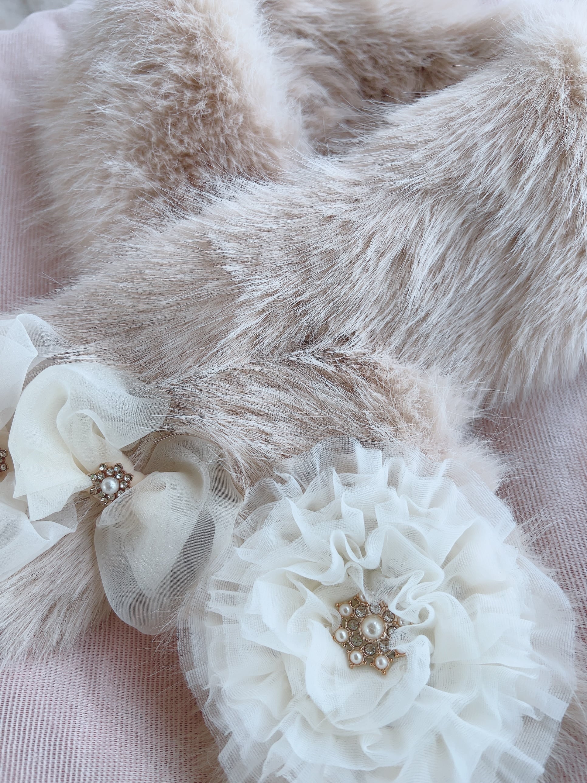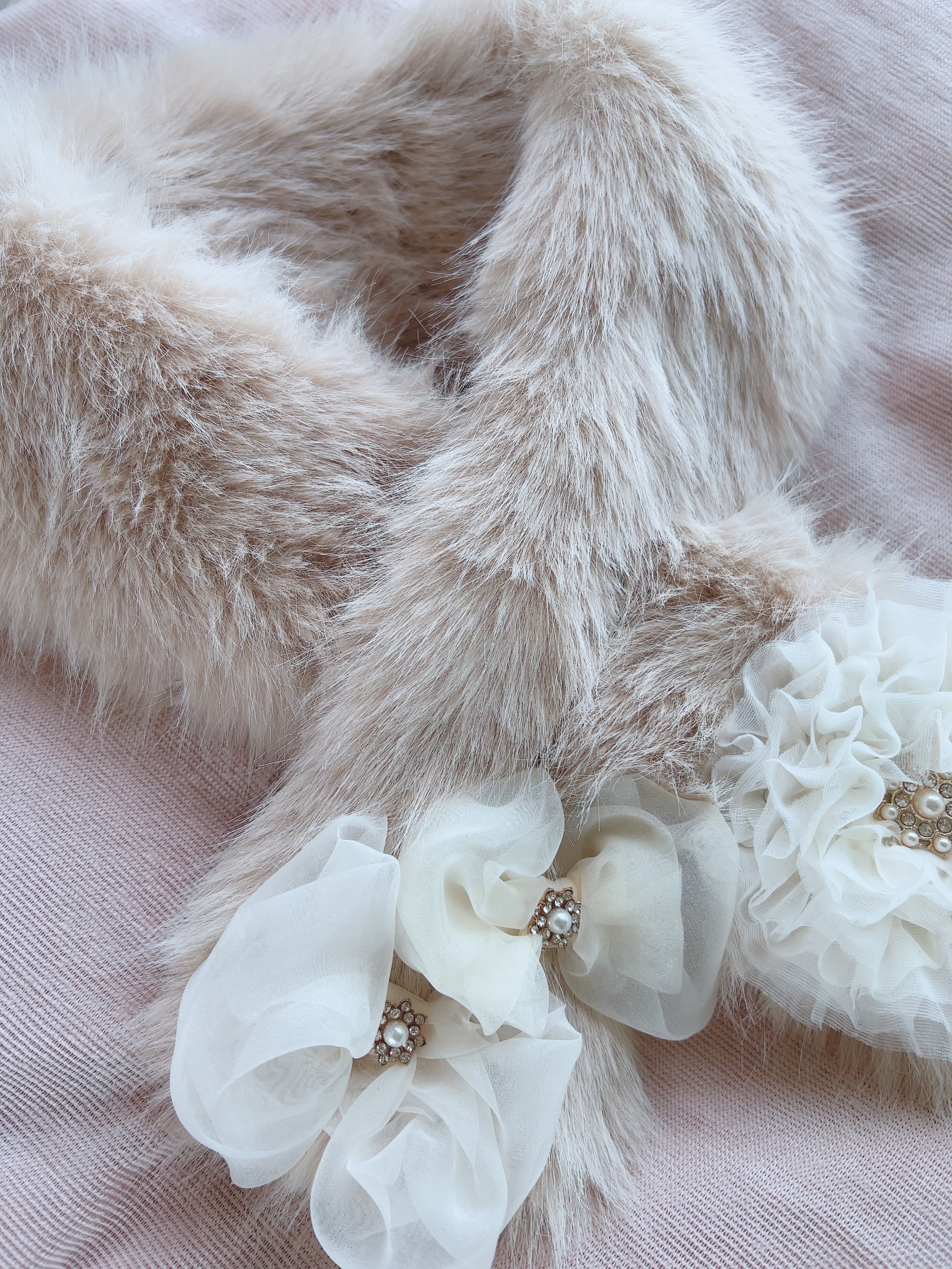 上質リッチなファーとお花とおリボンのマリアージュによるお上品な温かさが