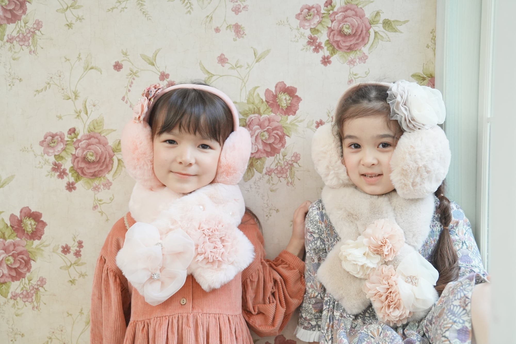 折りたたみのイヤーマフに、おリボンやお花、ビジューボタンをお好みでチョイス。