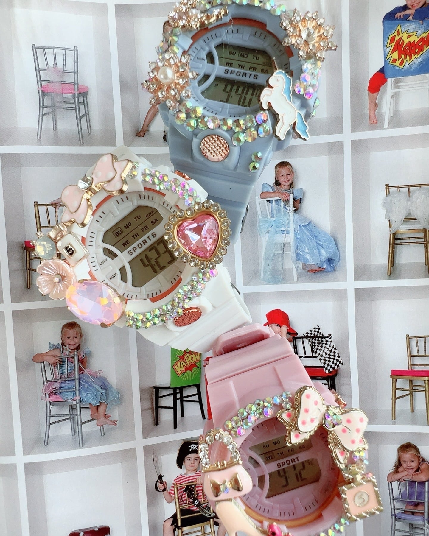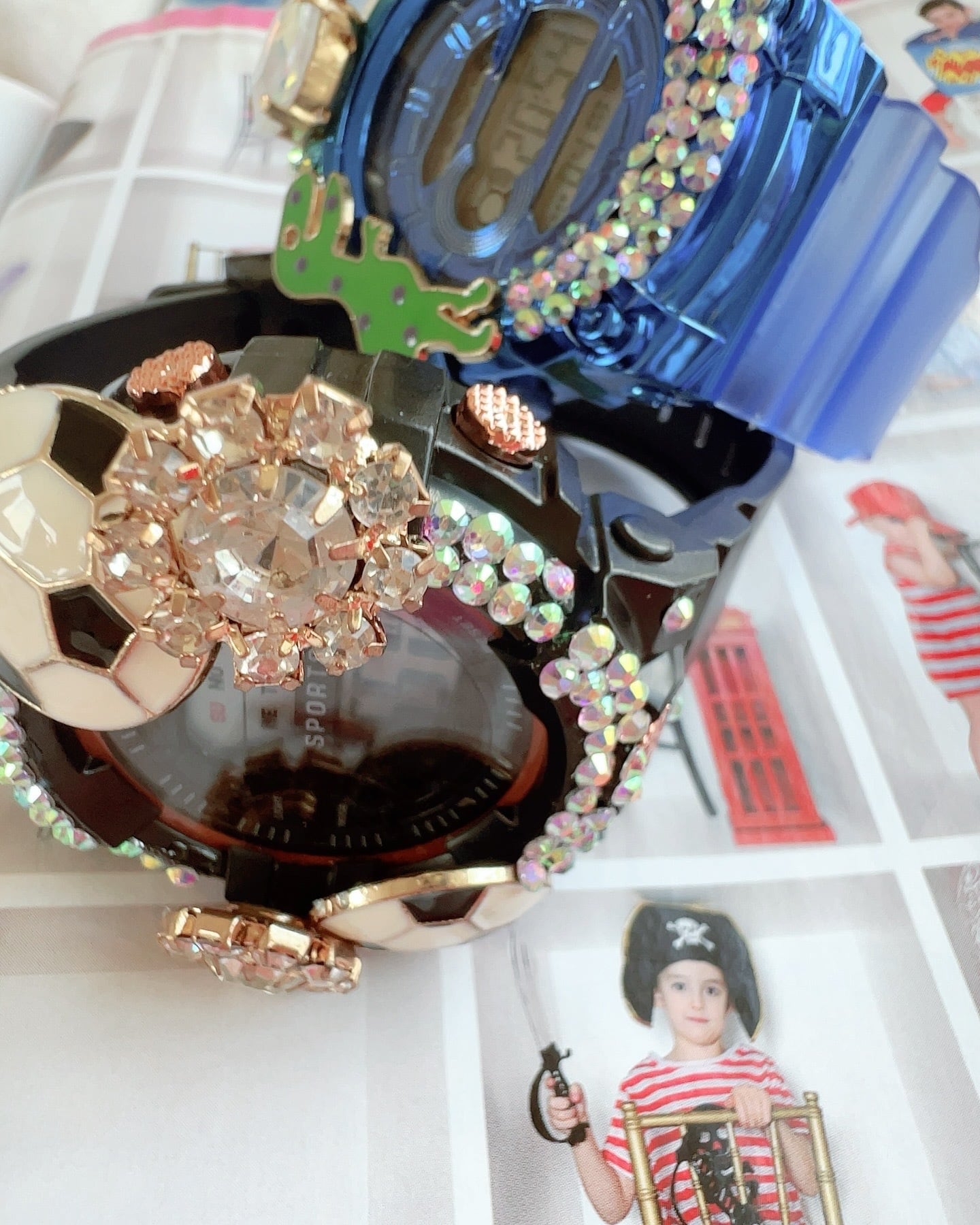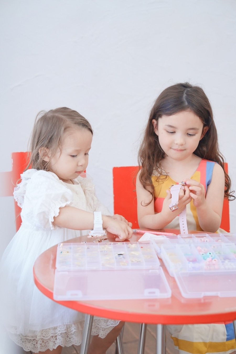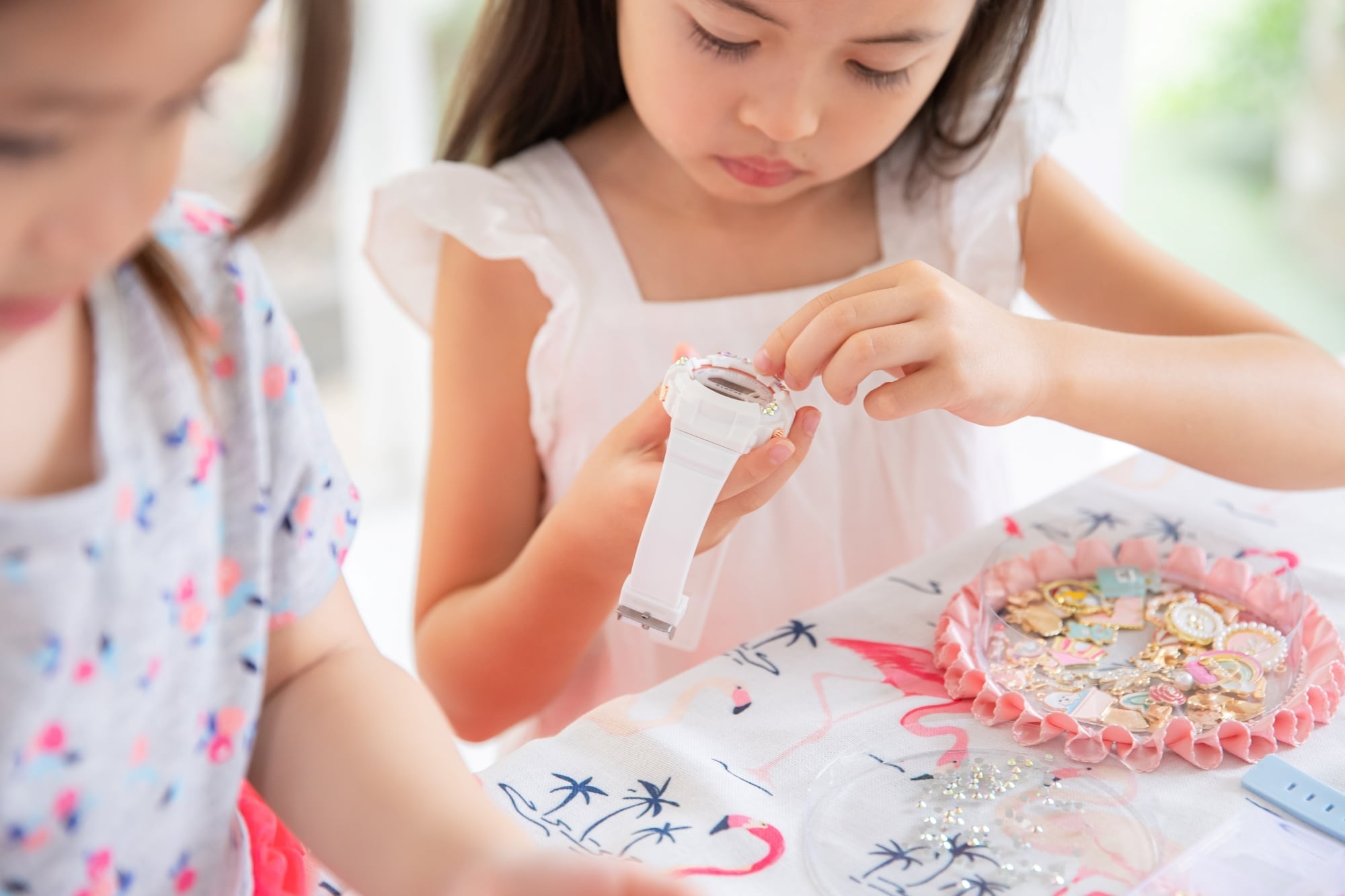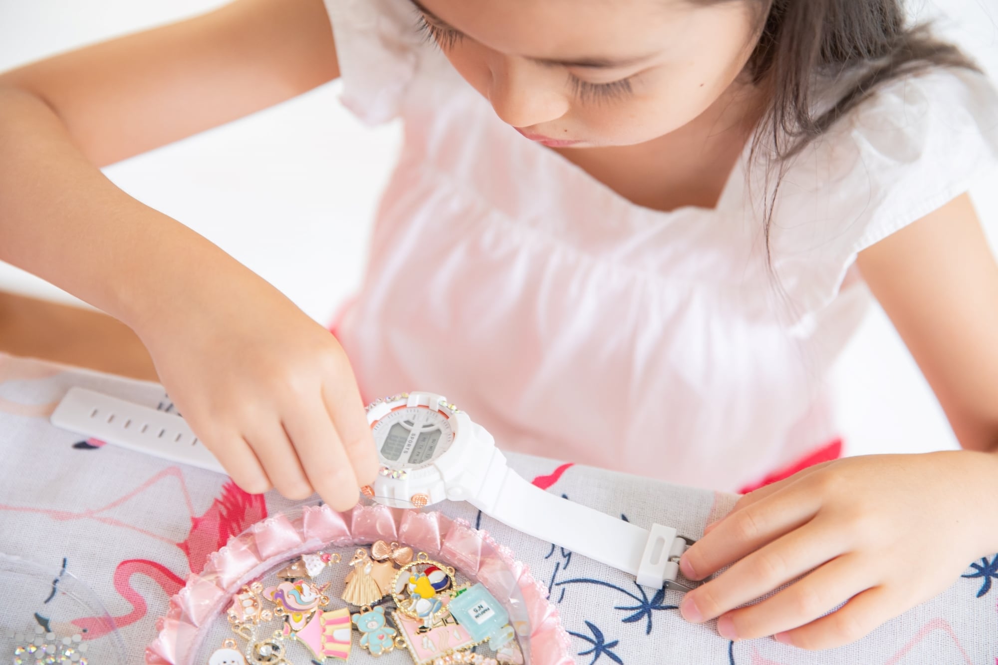 時計の色選びからラインストーンの接着、カスタマイズチャーム選びとデザインづくりまでをお子さまの手で取り組んでいただきます。
