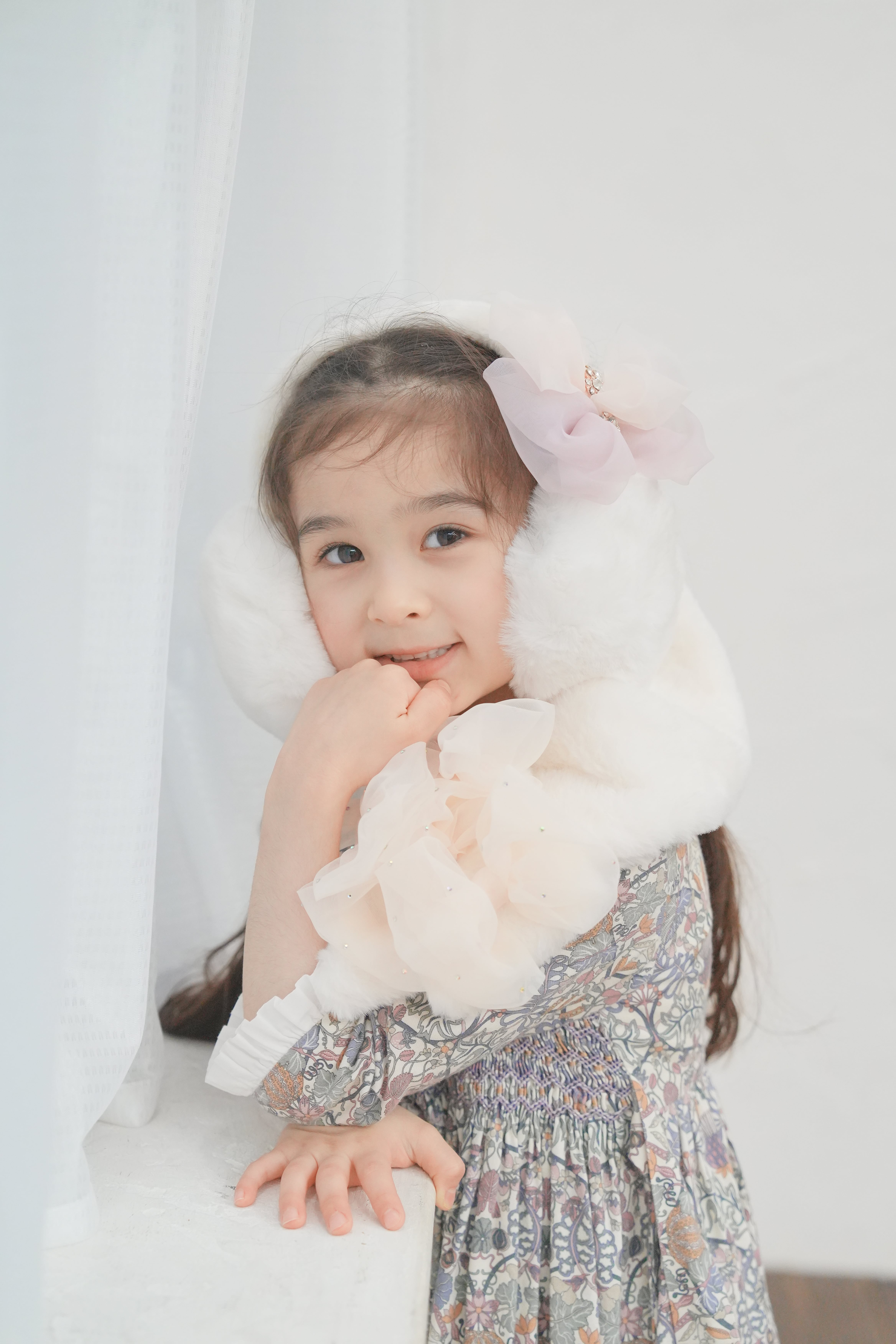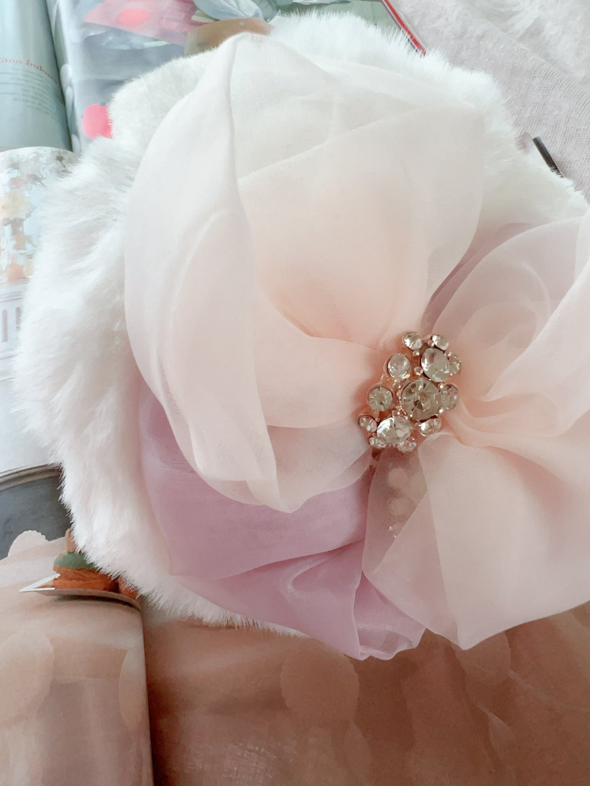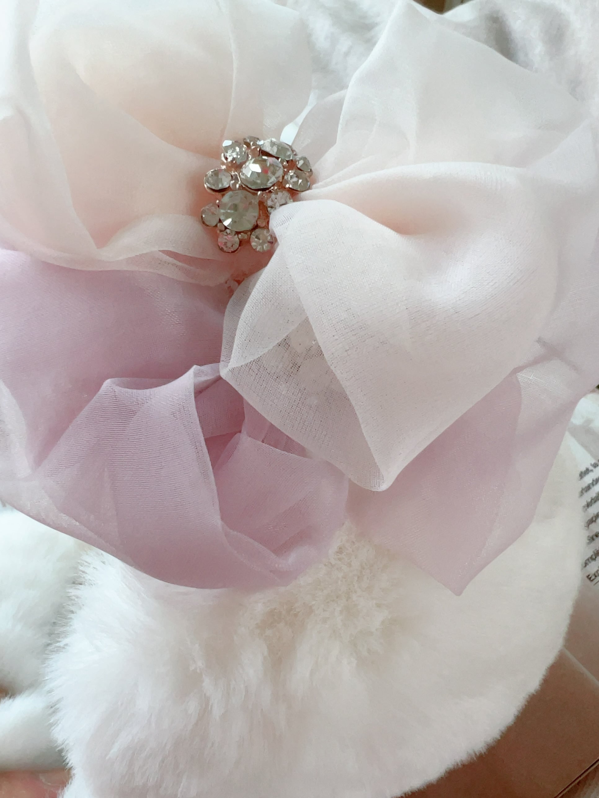 シフォンでつくった大きなおリボンをダブルで重ねてお嬢様感たっぷりの素敵なイヤーマフにお仕上げしております。