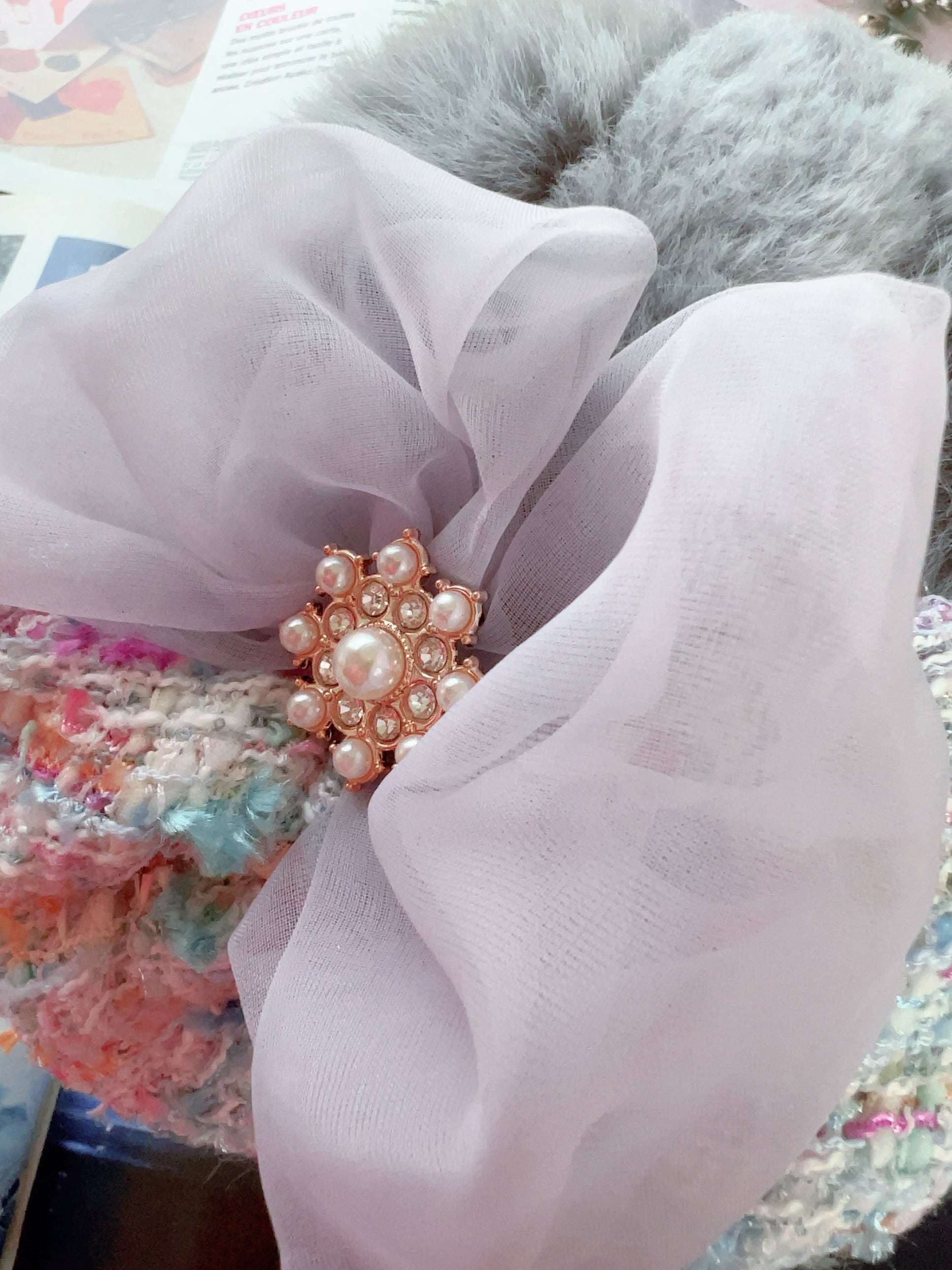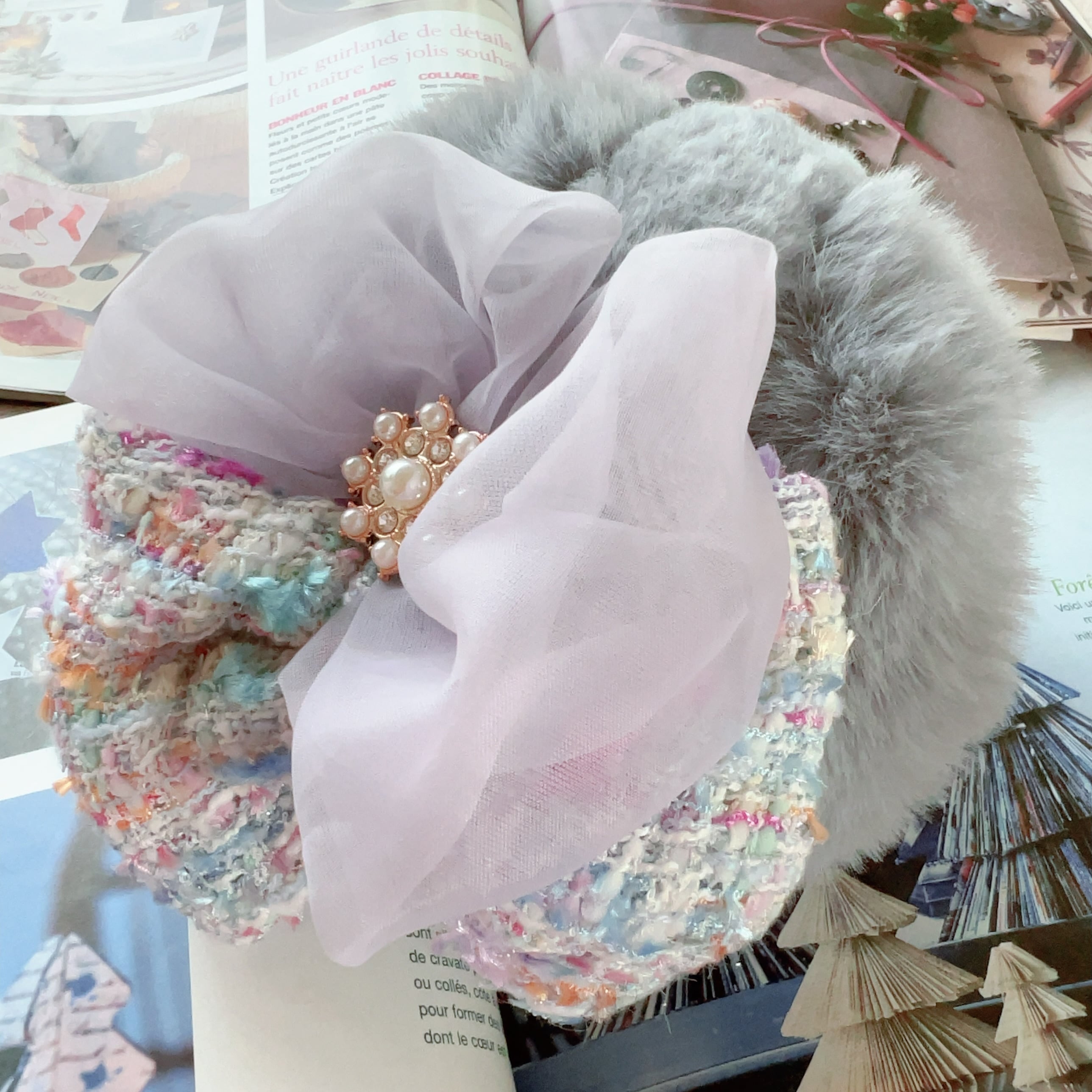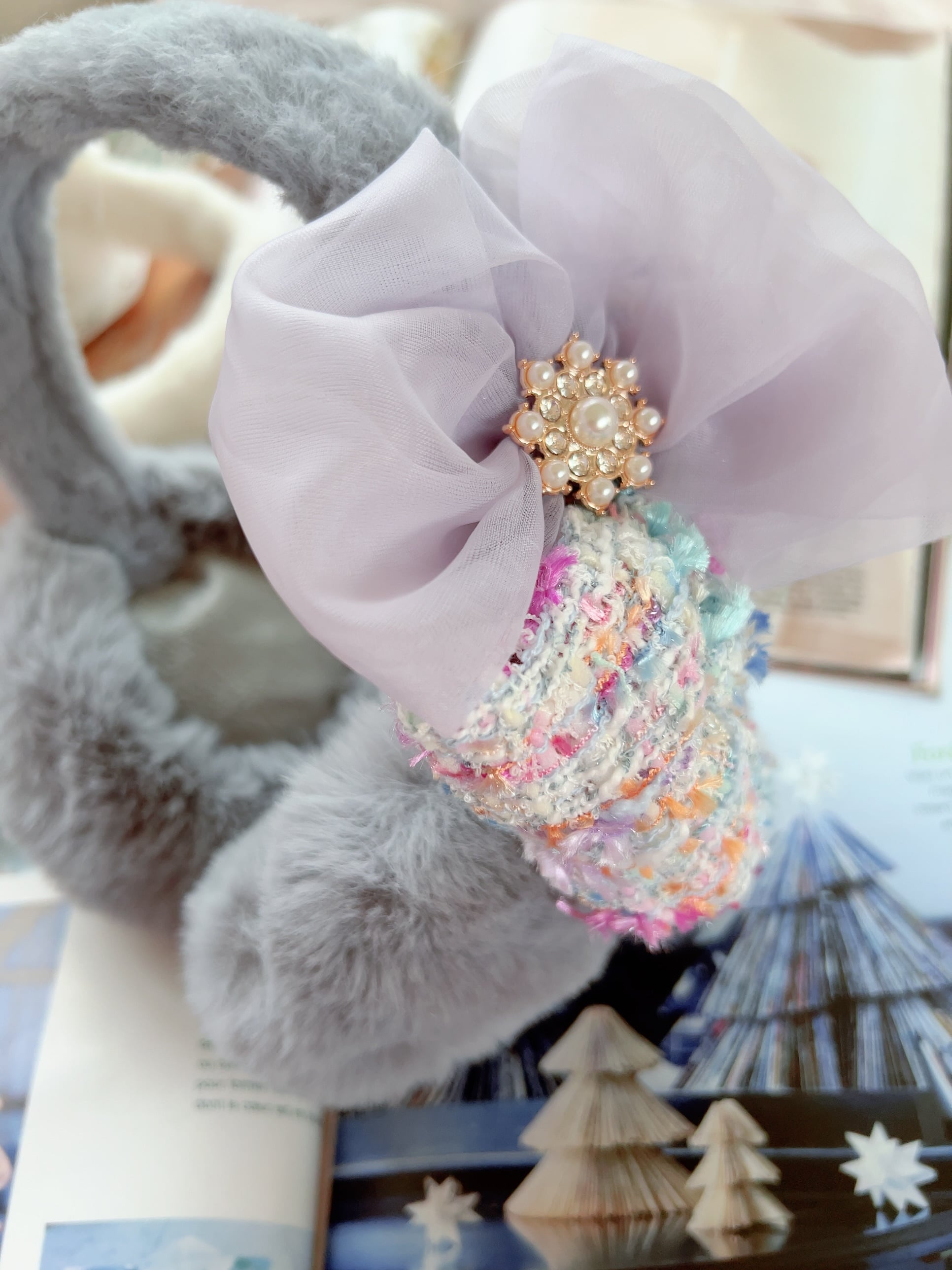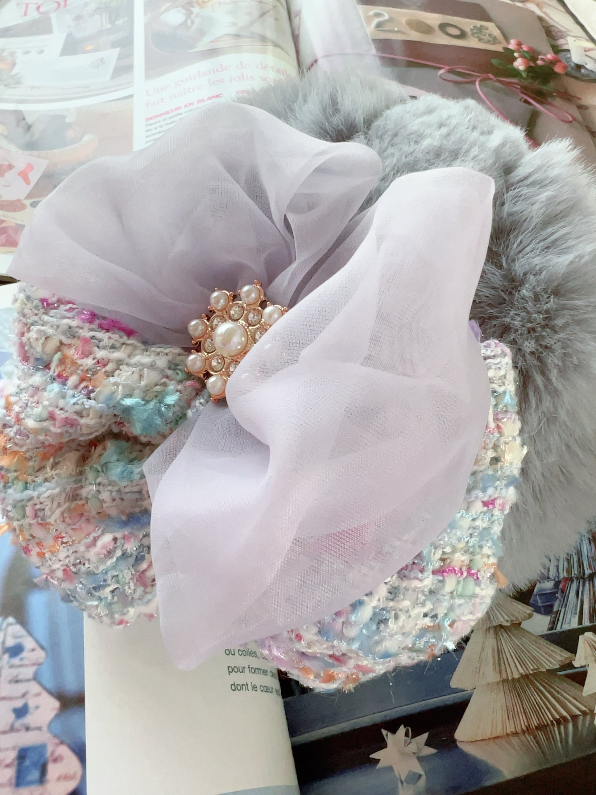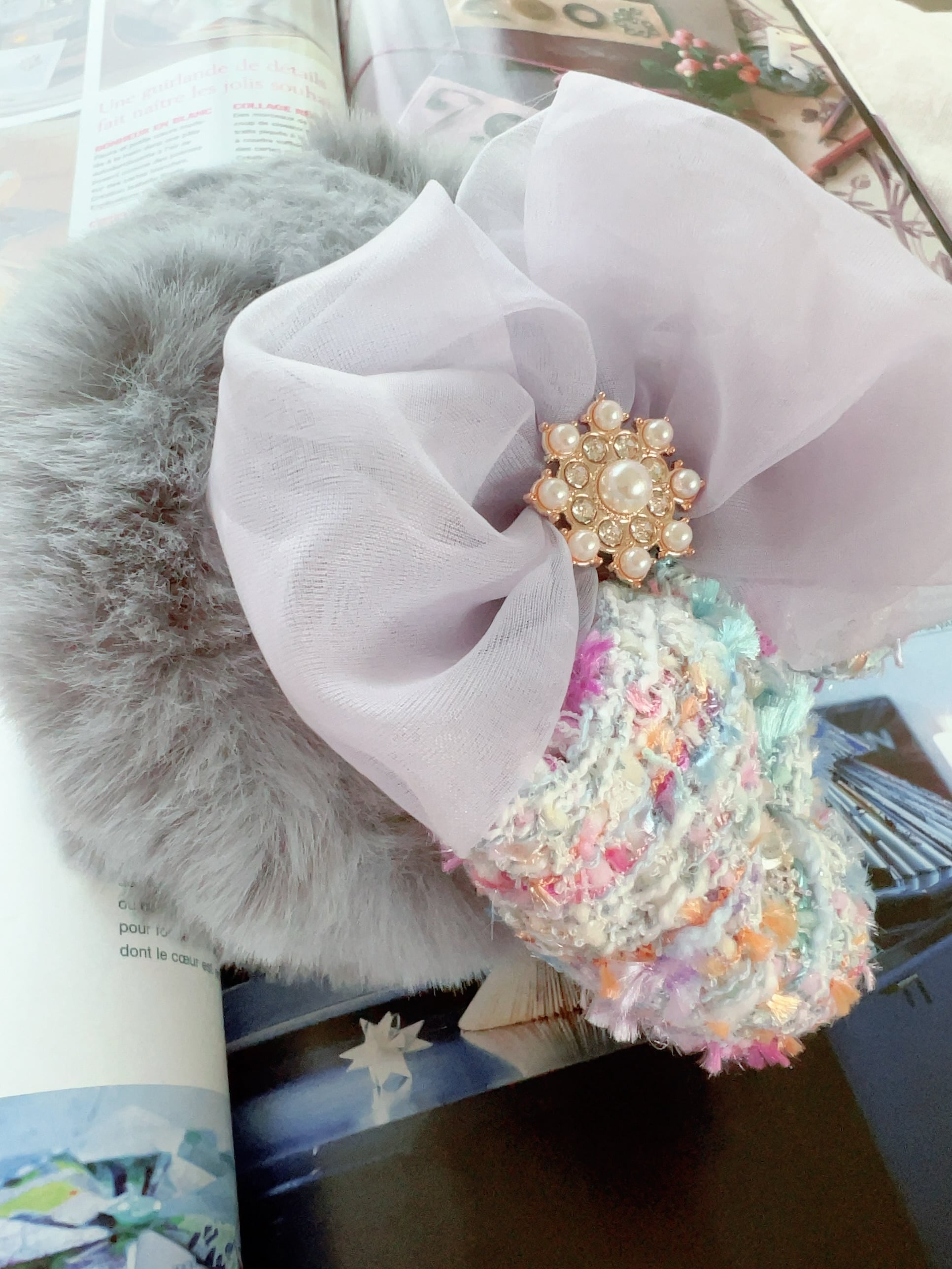 リッチなツイードでつくったおリボンとシフォンでつくったおリボンをダブルで重ねて、リッチでおちゃれなイヤーマフにお仕上げしております。