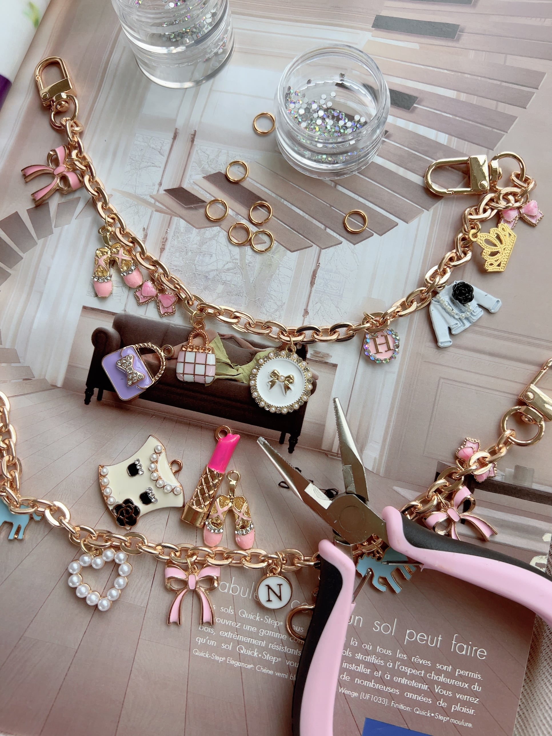 ゴールドのバッグチェーンにお好きなパーツチャームを飾り付けて、可愛いバッグのアクセントに。パーツチャームは40種類ほどのチャームの中からお好きなものを選んでいただいて、ラジオペンチで取り付けていただきます。