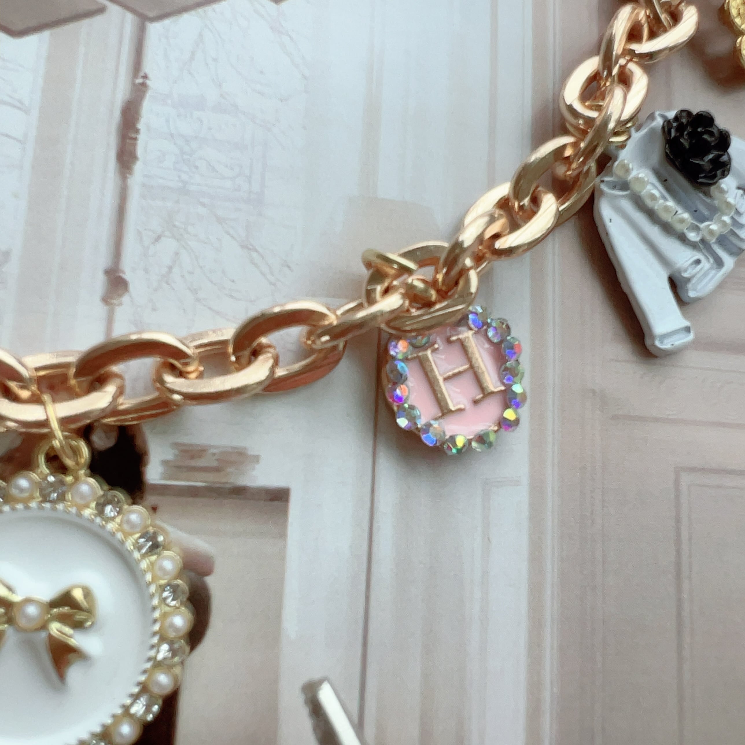 ゴールドのバッグチェーンにお好きなパーツチャームを飾り付けて、可愛いバッグのアクセントに。パーツチャームは40種類ほどのチャームの中からお好きなものを選んでいただいて、ラジオペンチで取り付けていただきます。