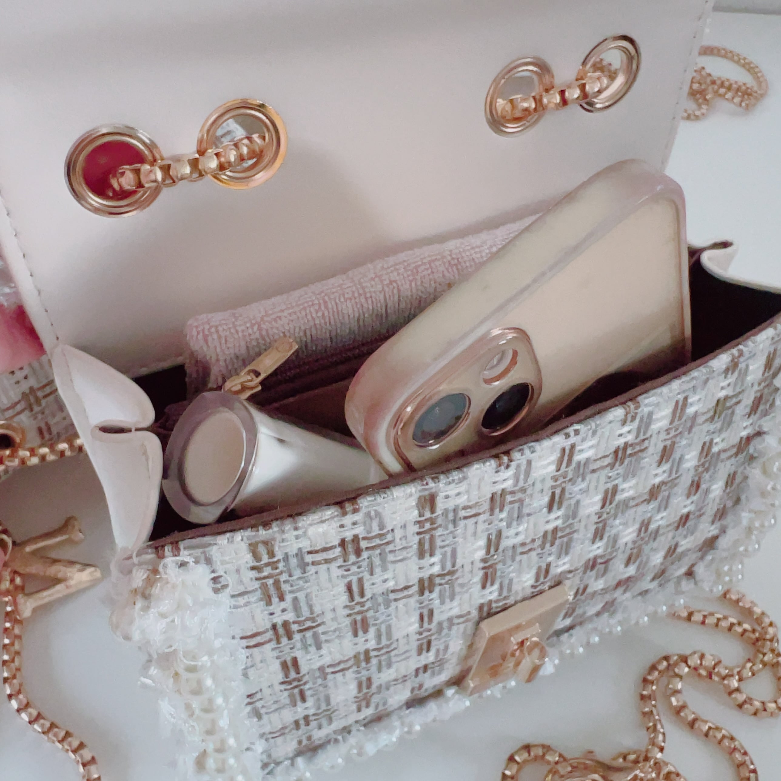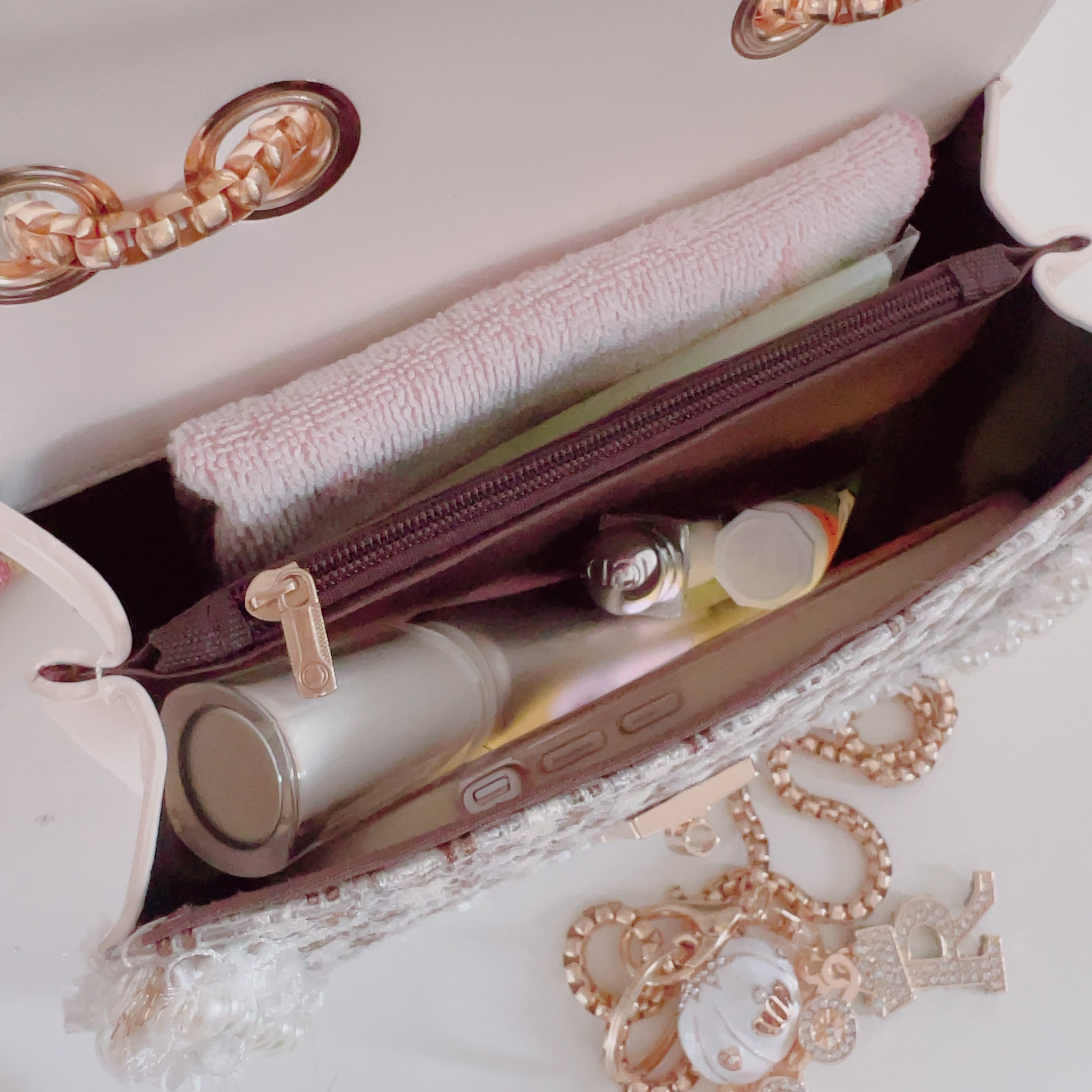 ファスナー付きの内ポケットもあり、スマホやハンカチタオル、リップグロスも余裕をもって入ります。