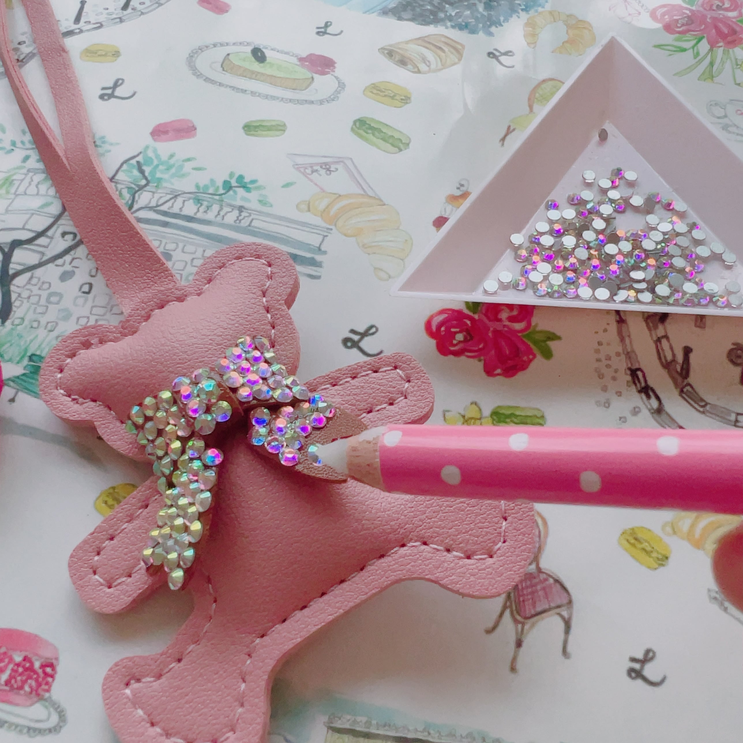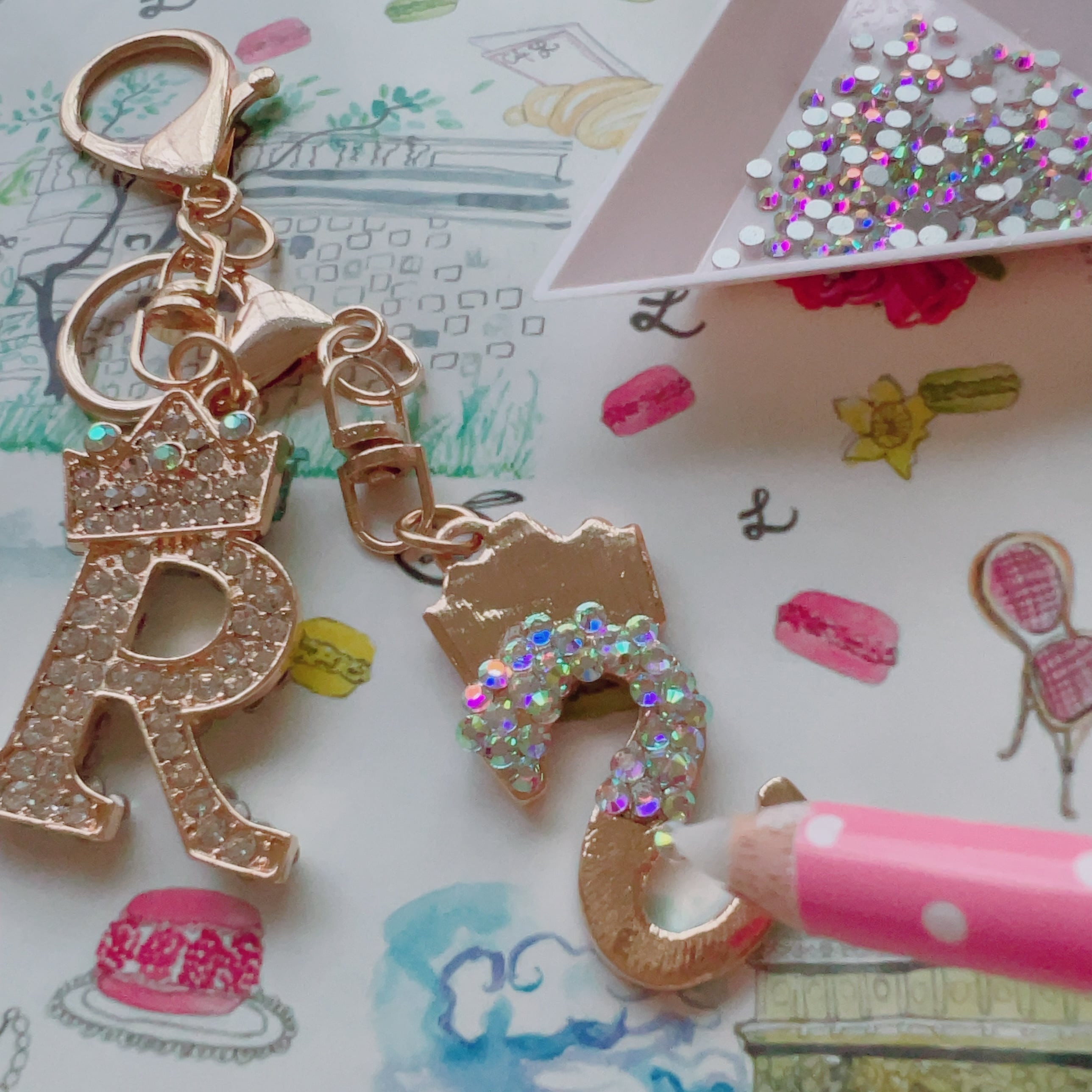 ご予約時にご選択頂きましたアルファベットにプチチャームやラインストーンをデコレートして、きらきら輝くイニシャルバッグチャームをお作りいただけます。