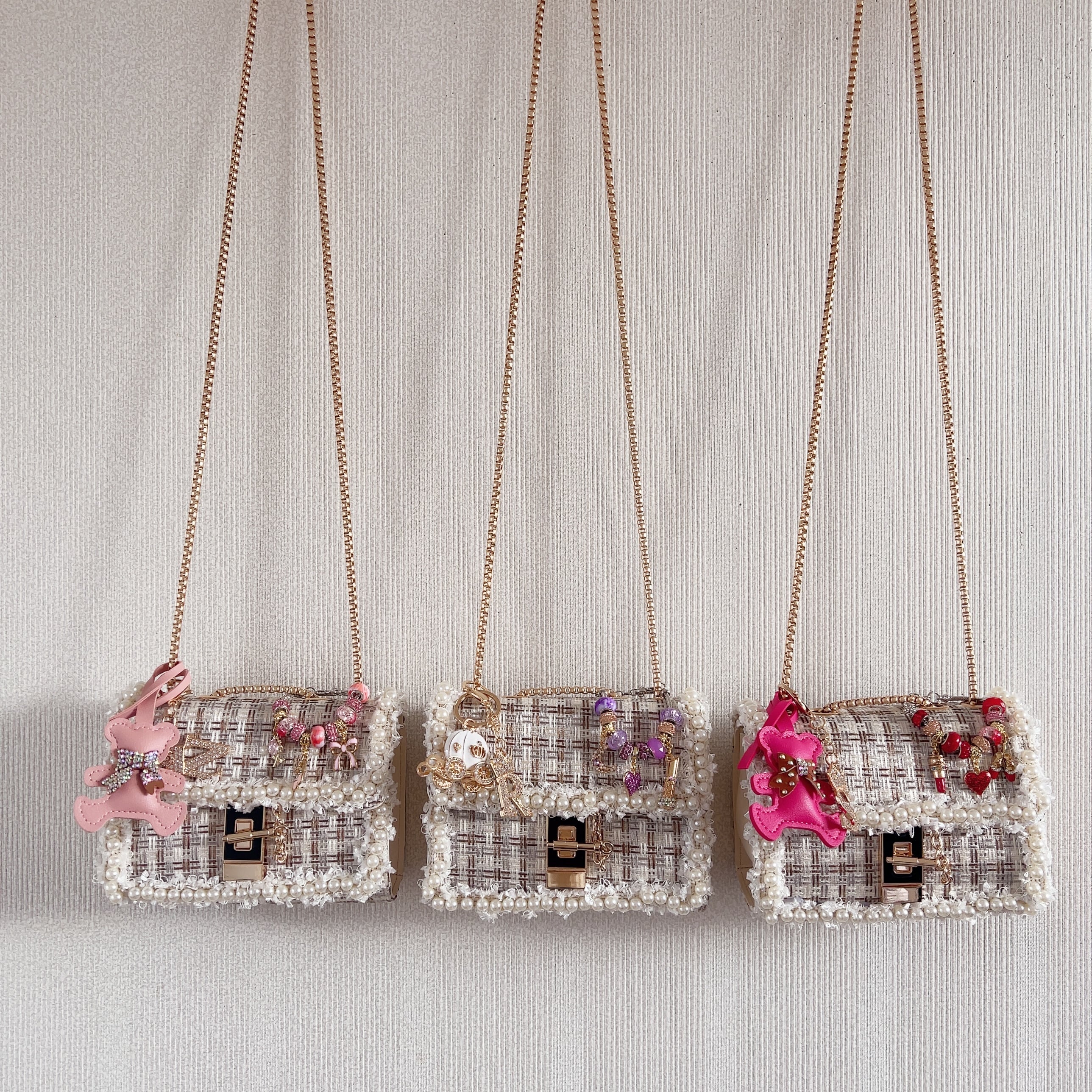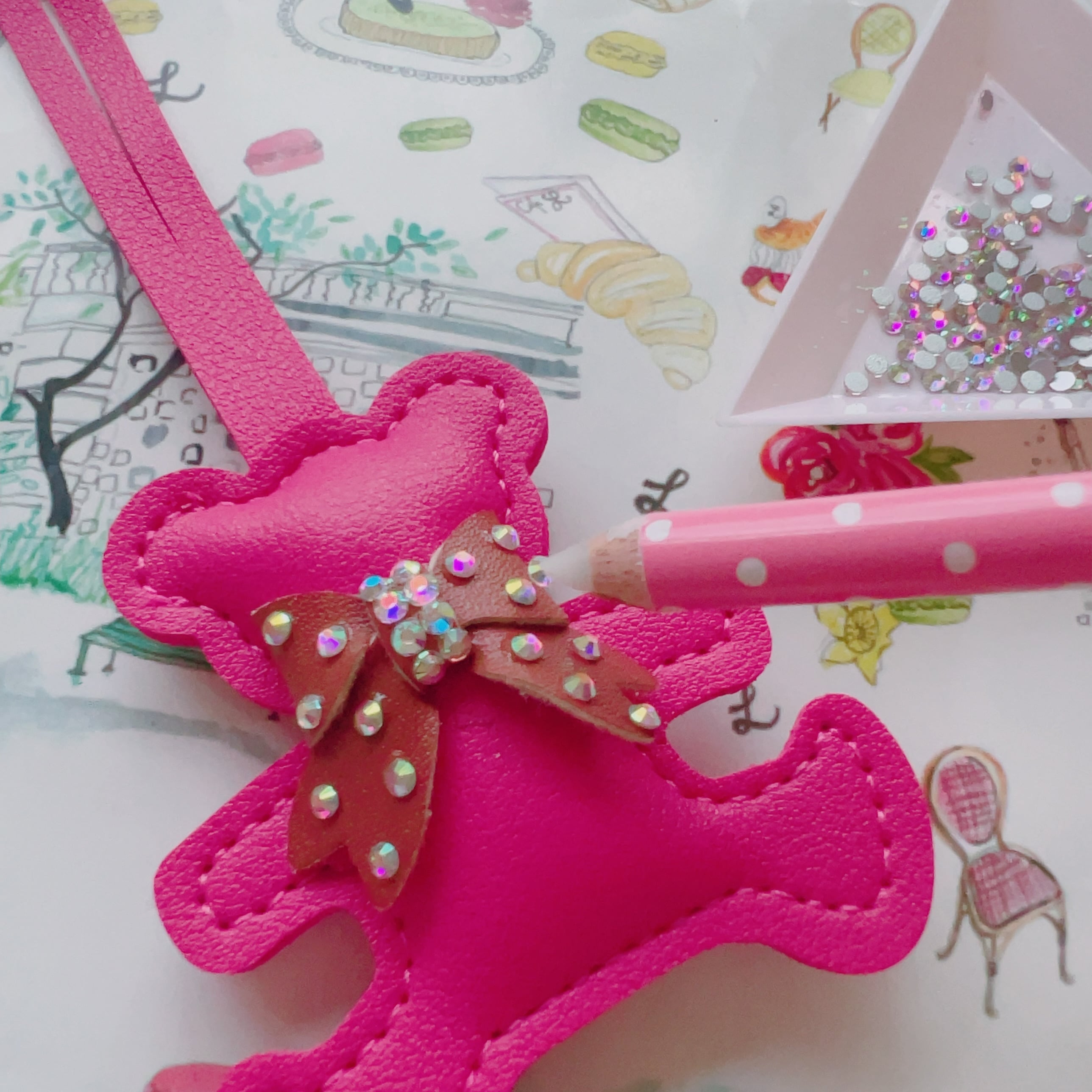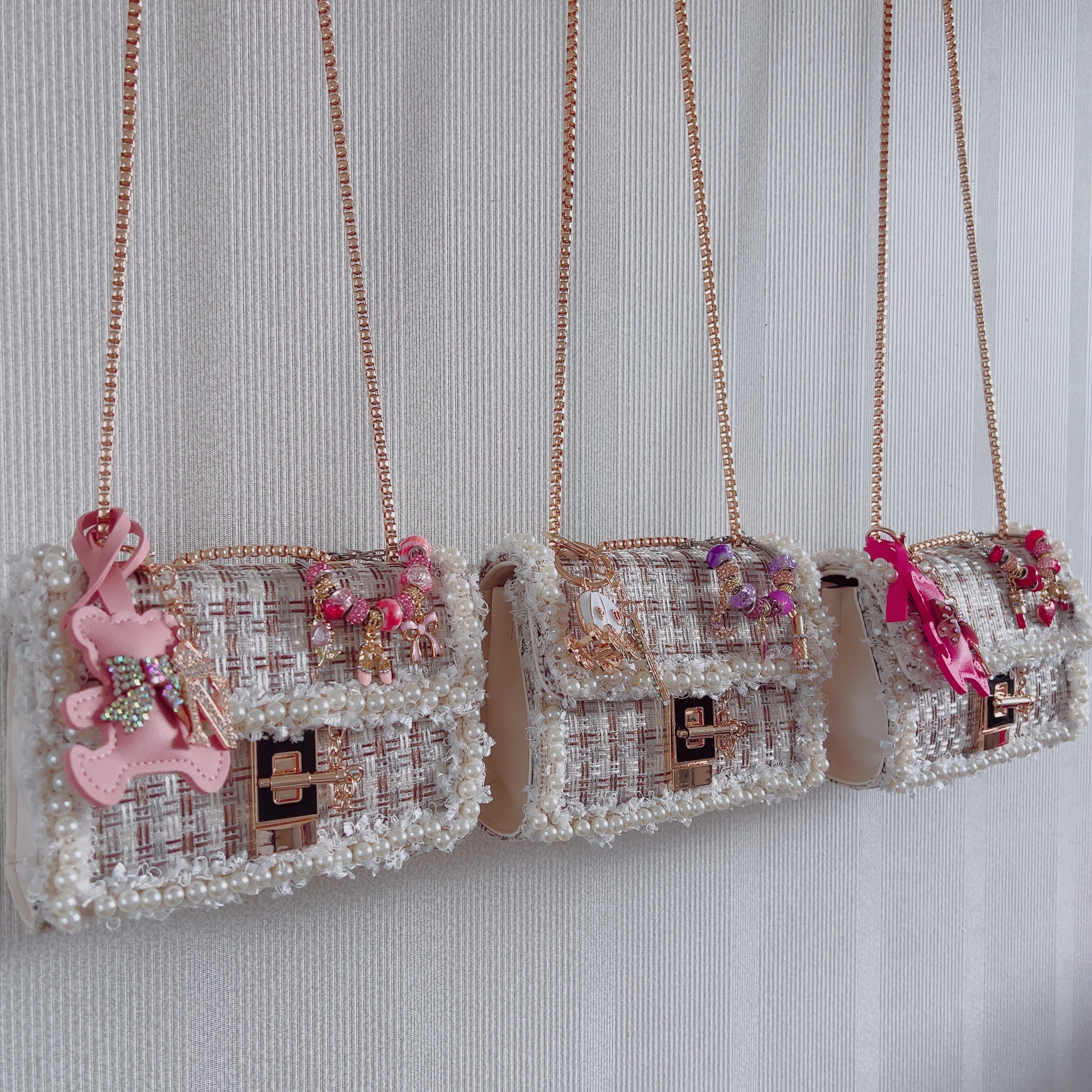 多数のバッグチャームの中からお好きなバッグチャームをお選びいただき、ラインストーンやチャームで可愛さをスキップアップしていただけます。