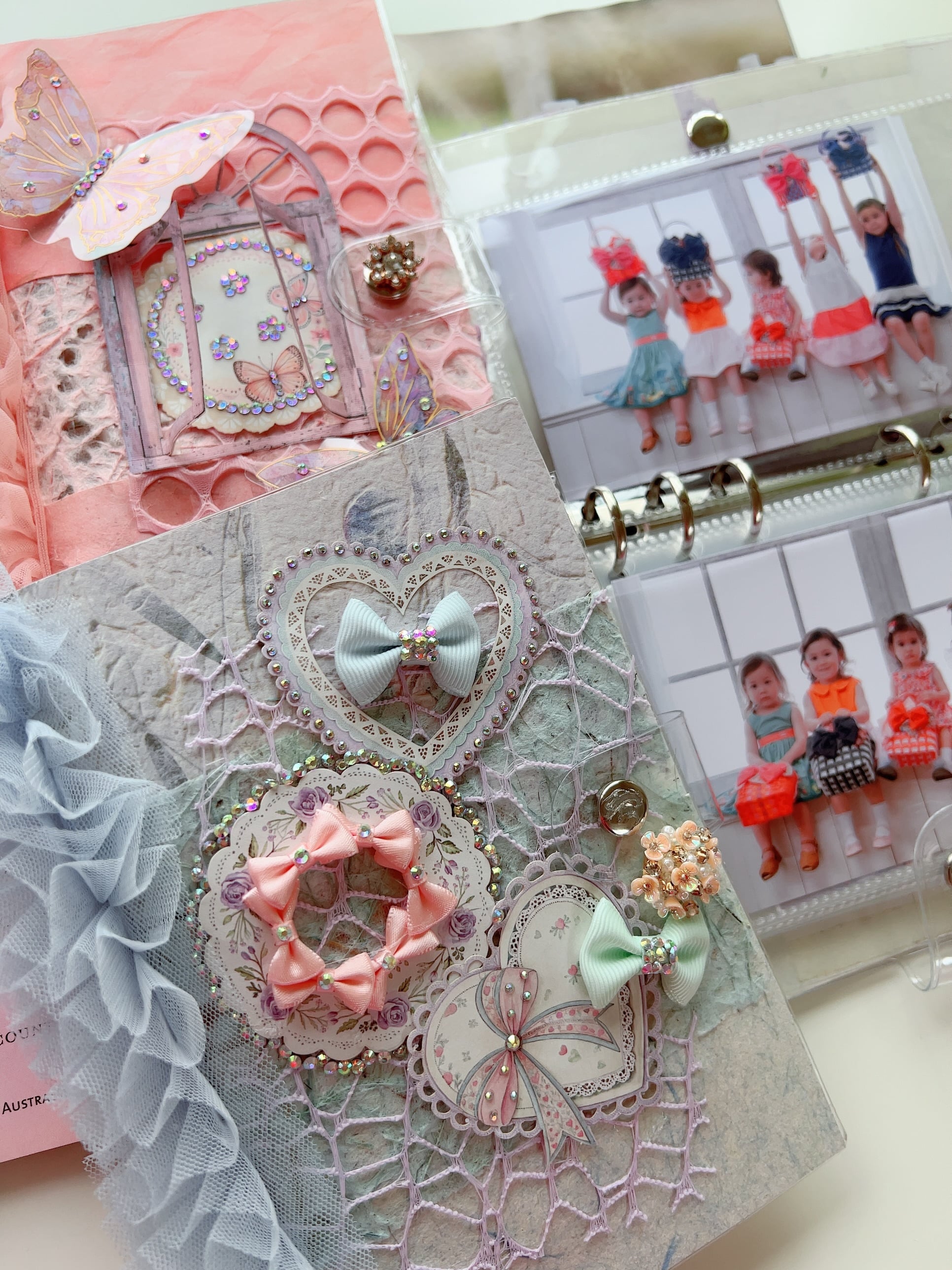 豊富な種類のペーパーやデザイン素材、おリボン、ビジューチャームやラインストーンを組み合わせて、スクラップブッキングの手法の1つであるコラージュという表現方法を使って、