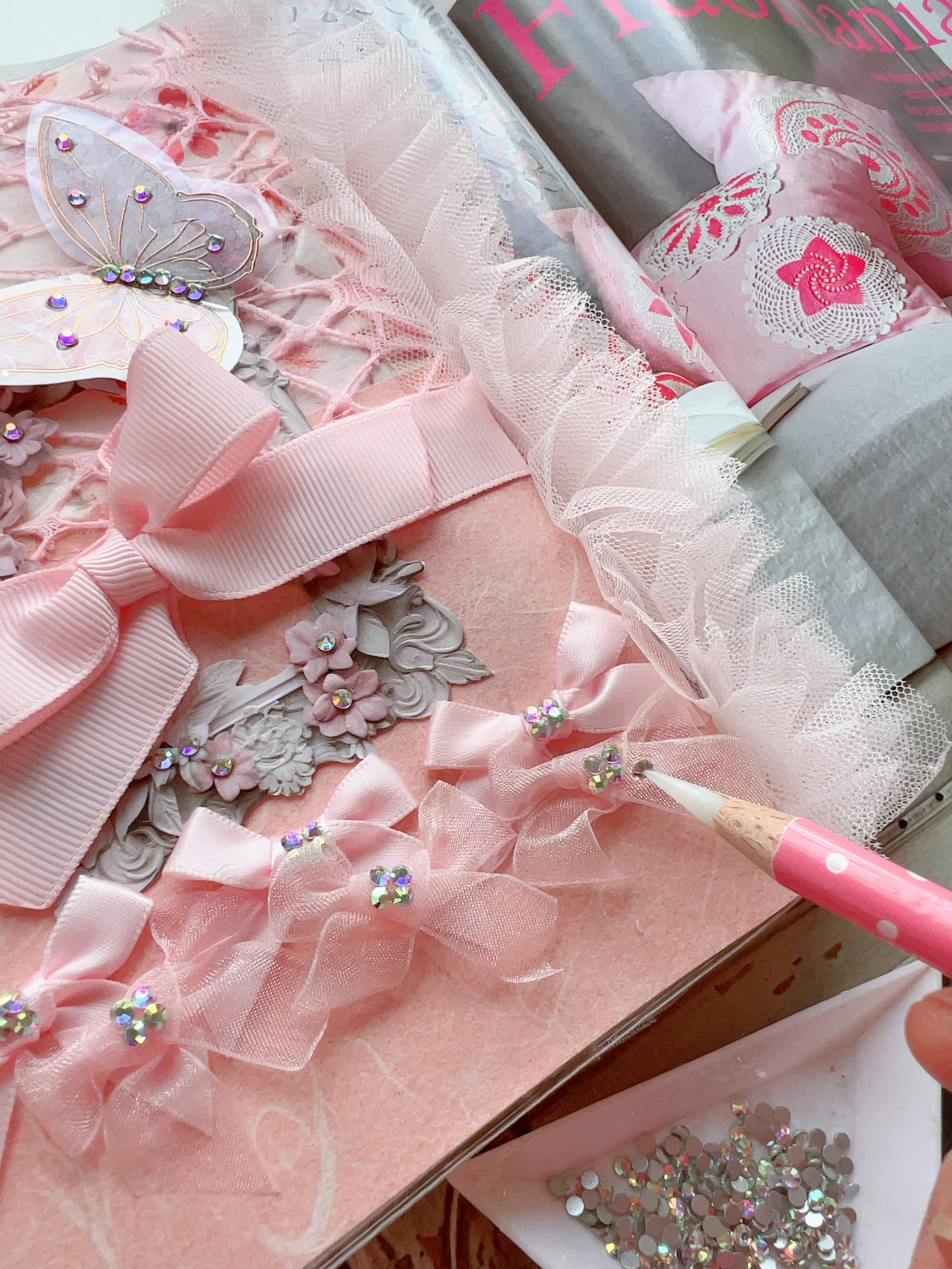 ベースとなるペーパー選びとペーパーカット→その他のデザイン素材選びとデザイン決定→本体への接着(表面・裏面)→ビジューパーツやリボンやラインストーンで装飾をおこない完成へ