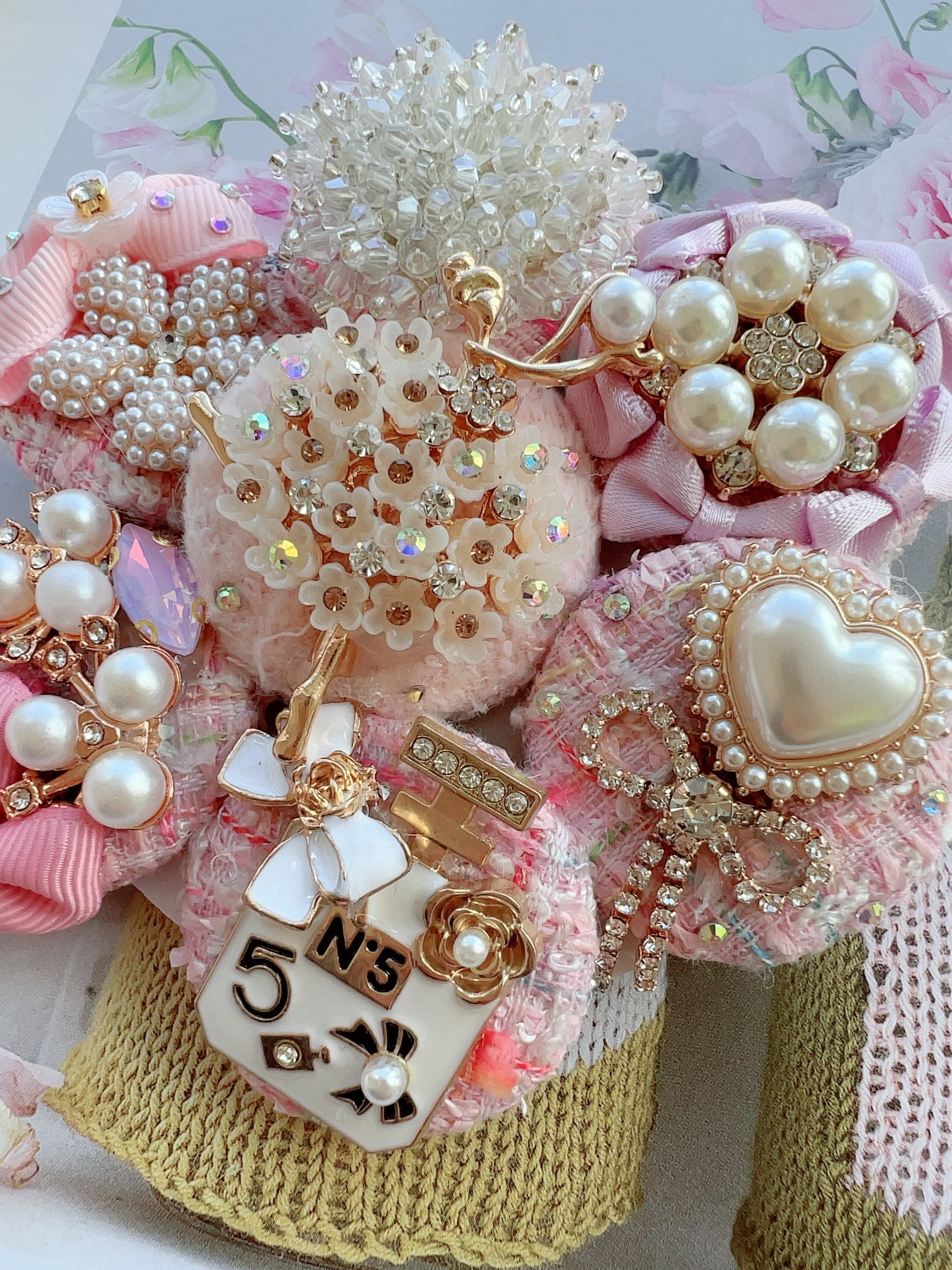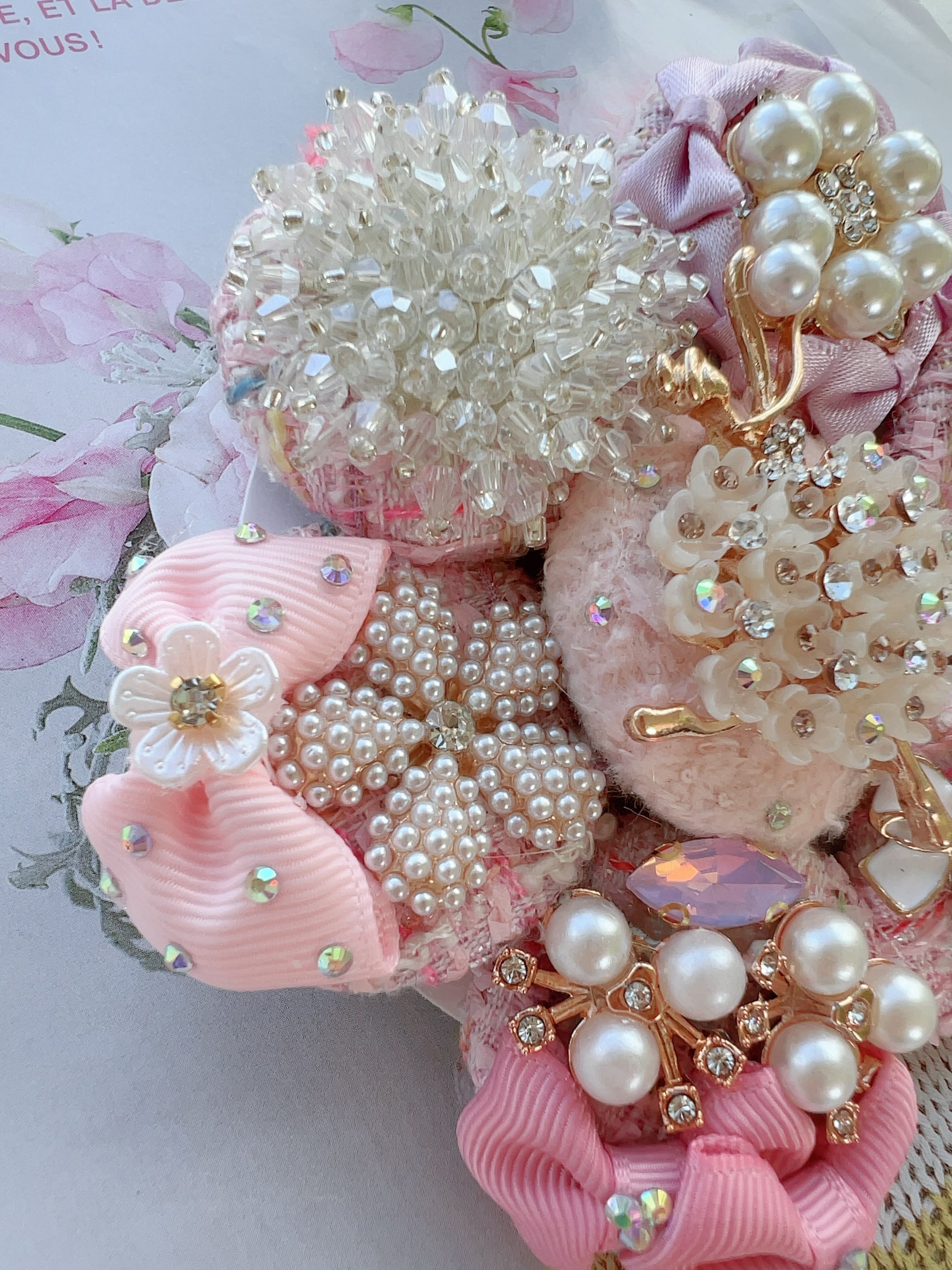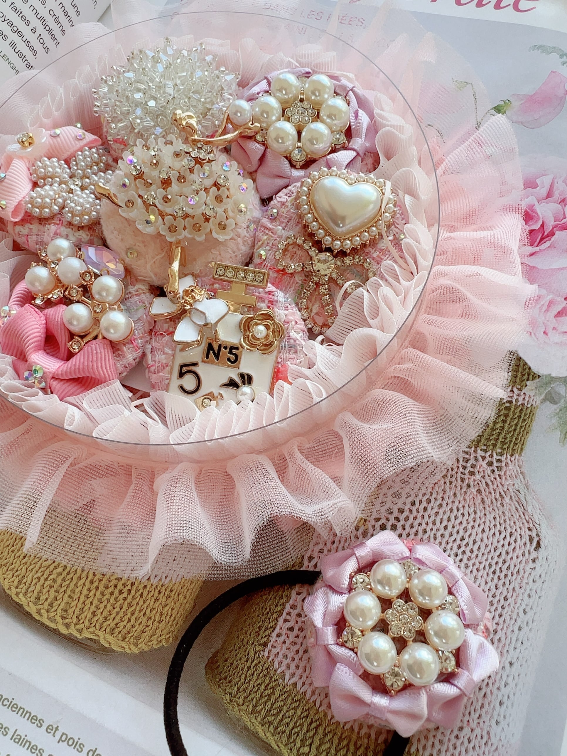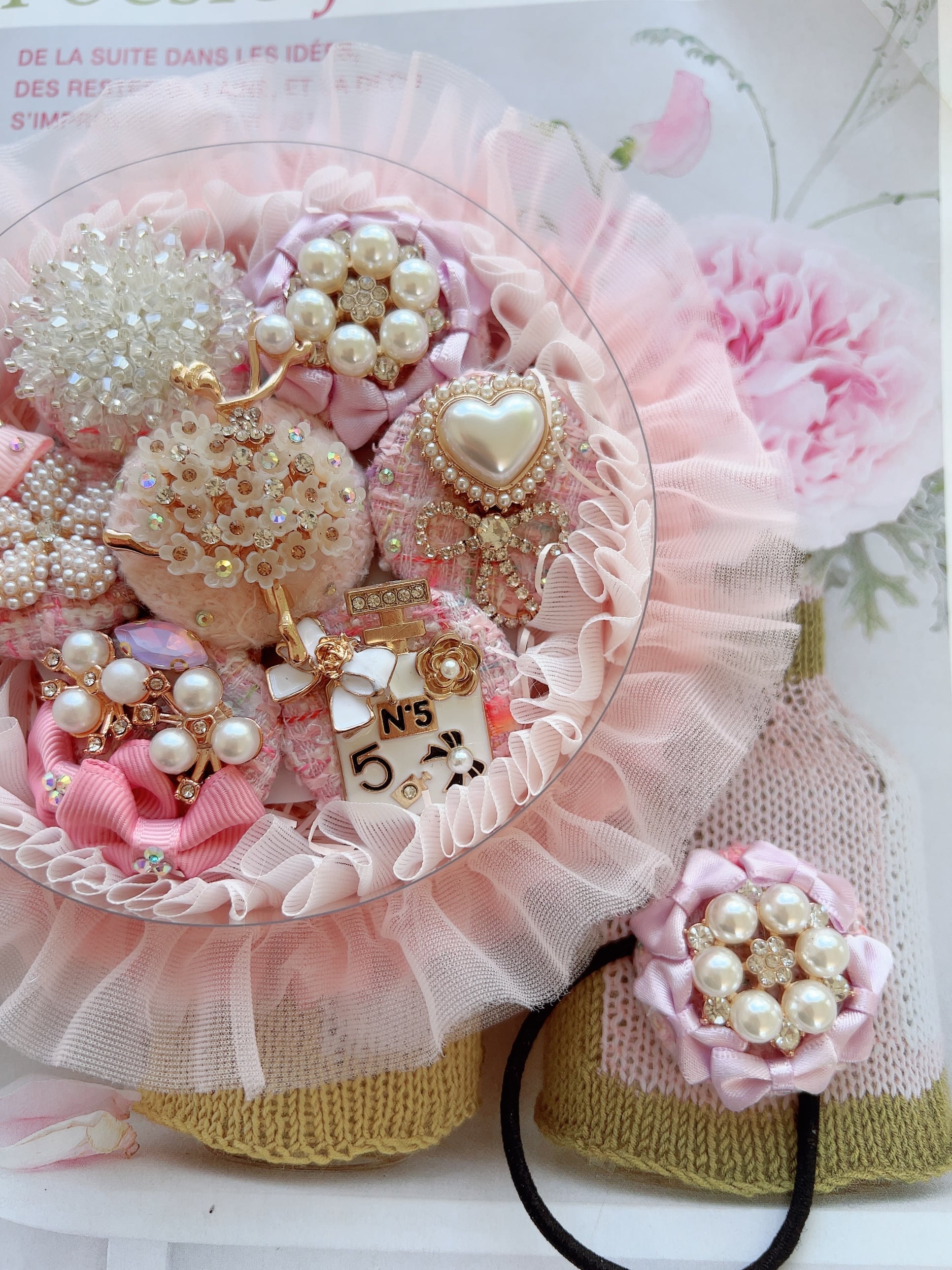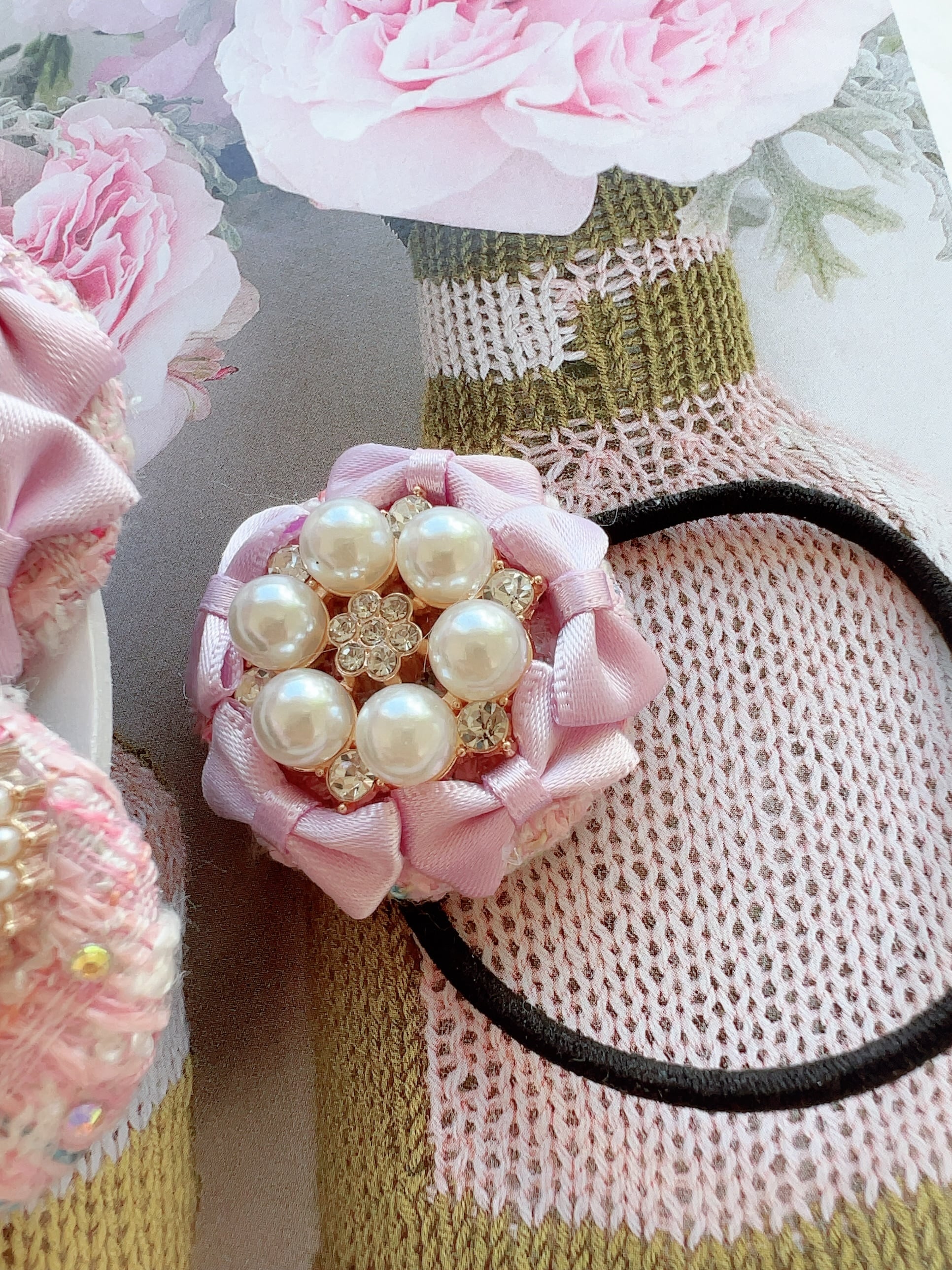 ベビーピンクのツイードくるみボタンと素敵なバレリーナのヘアゴムを彩る6つのビジューチャームのヘアゴム