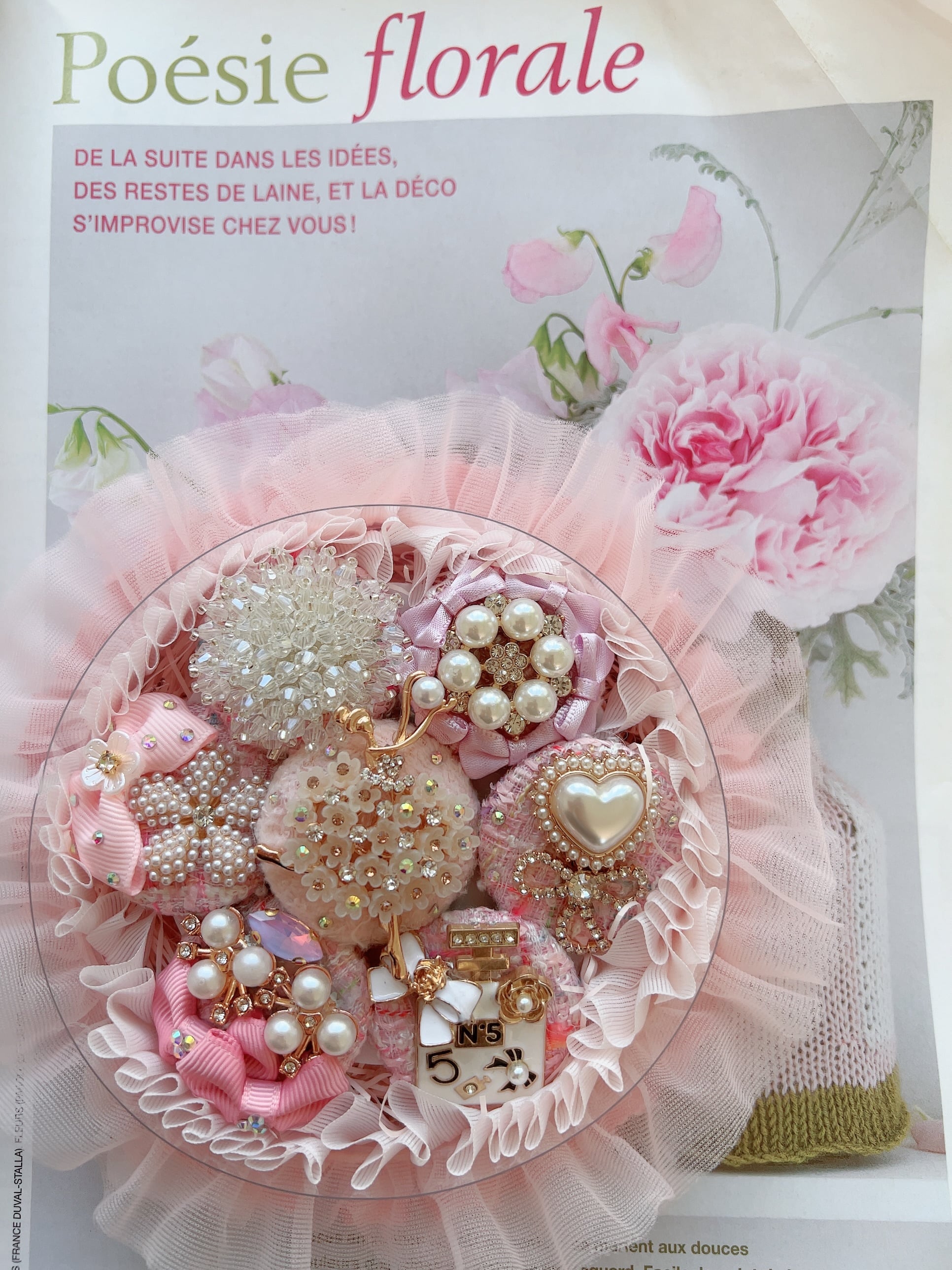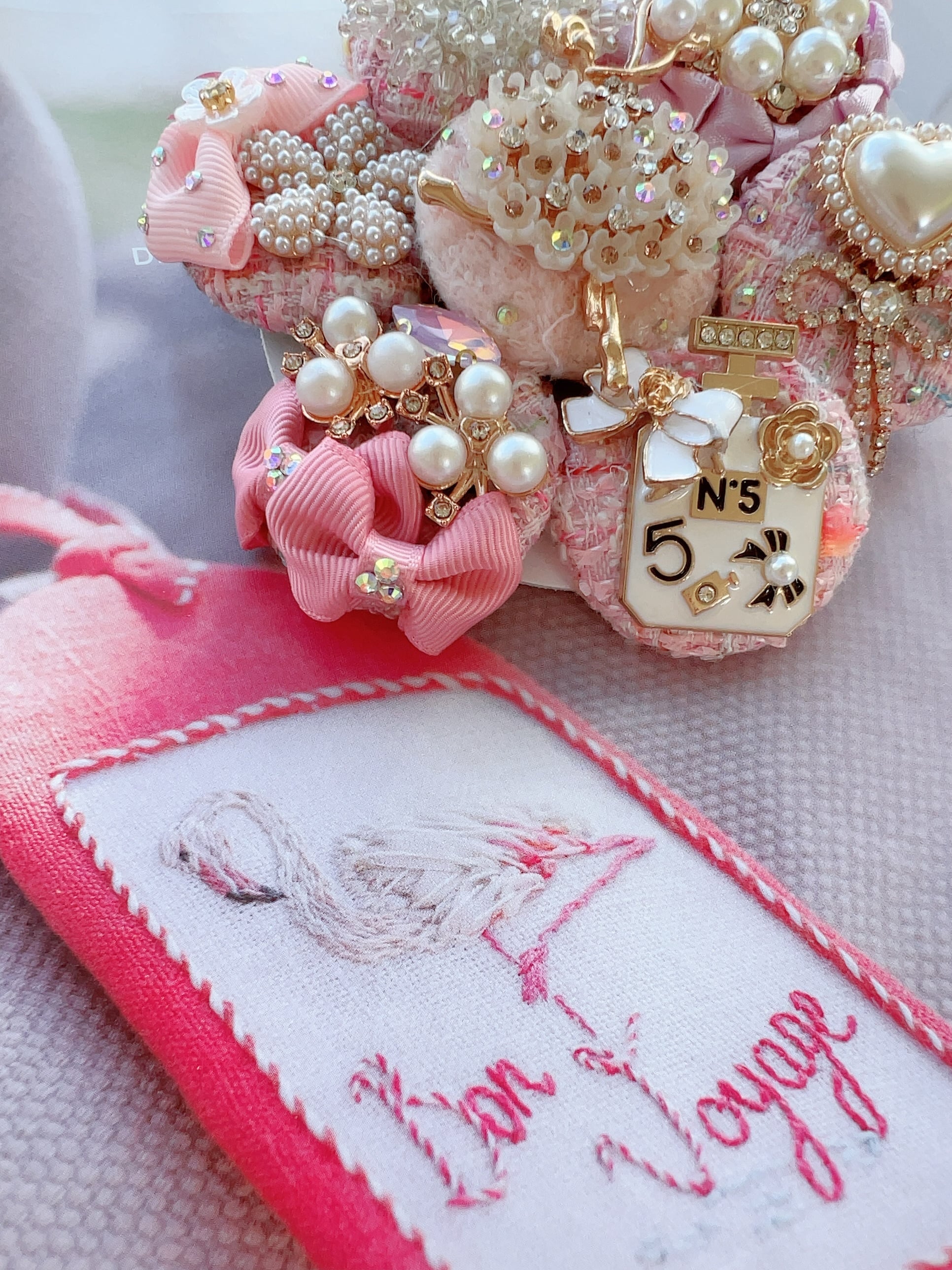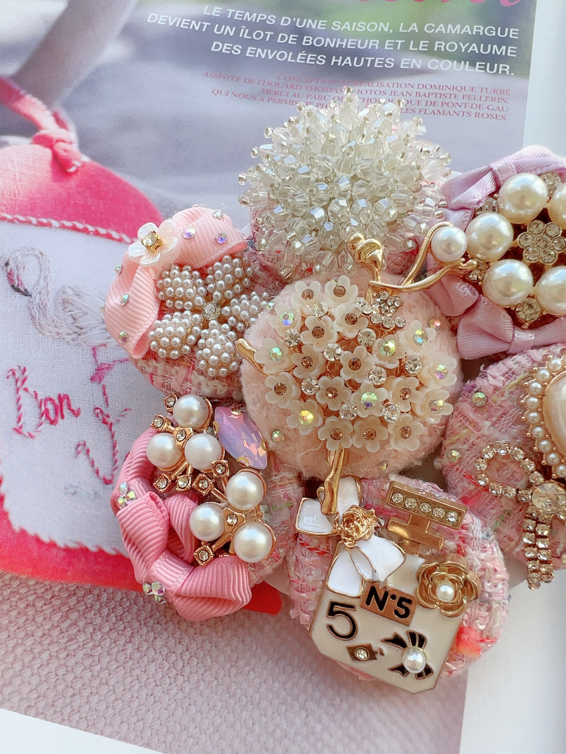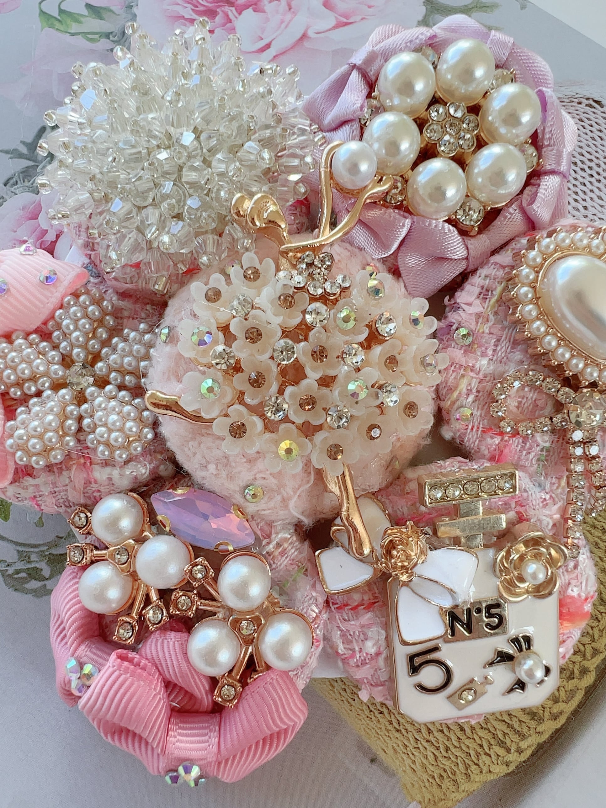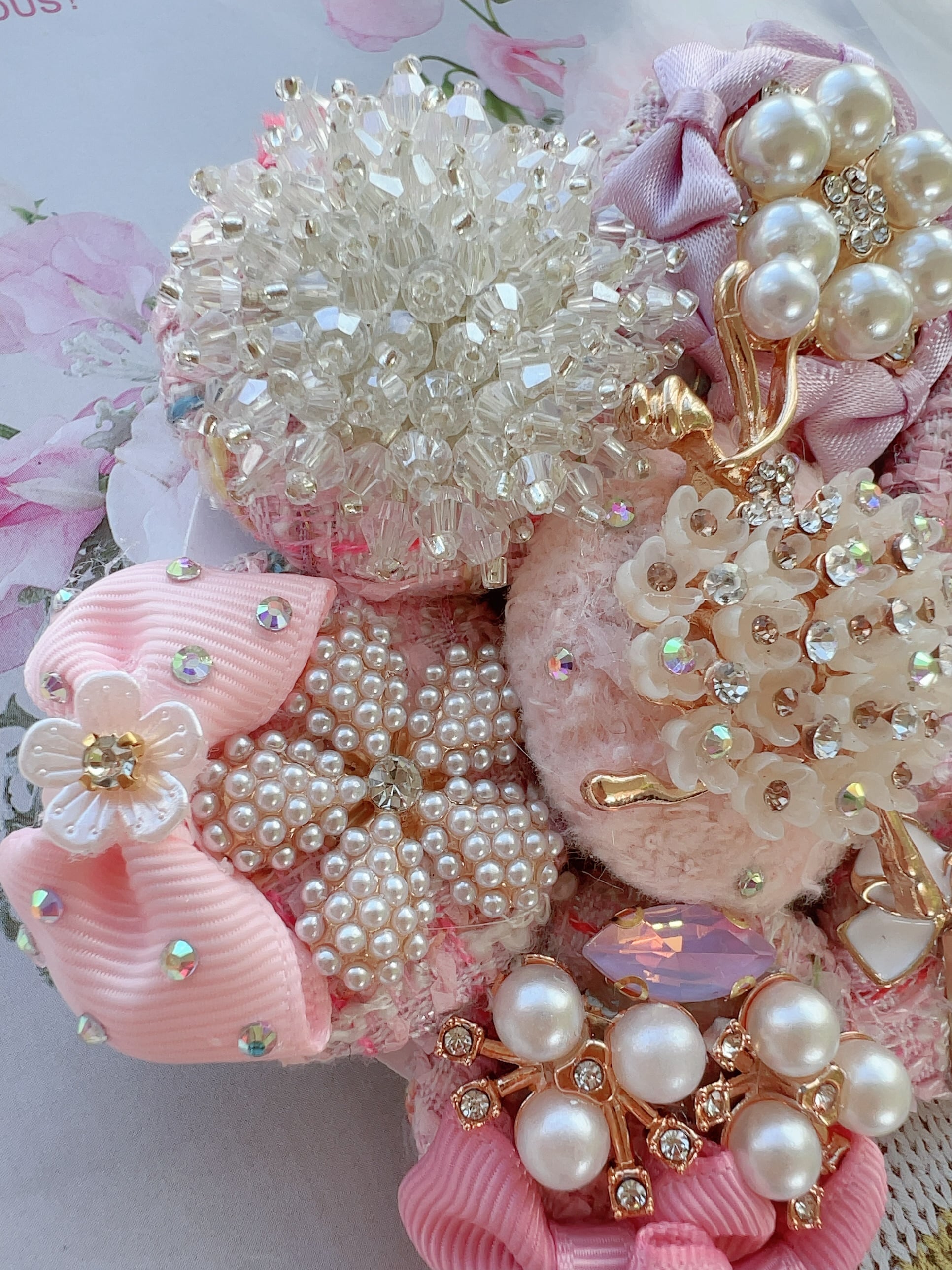 ベビーピンクのツイードくるみボタンと素敵なバレリーナのヘアゴムを彩る6つのビジューチャームのヘアゴム
