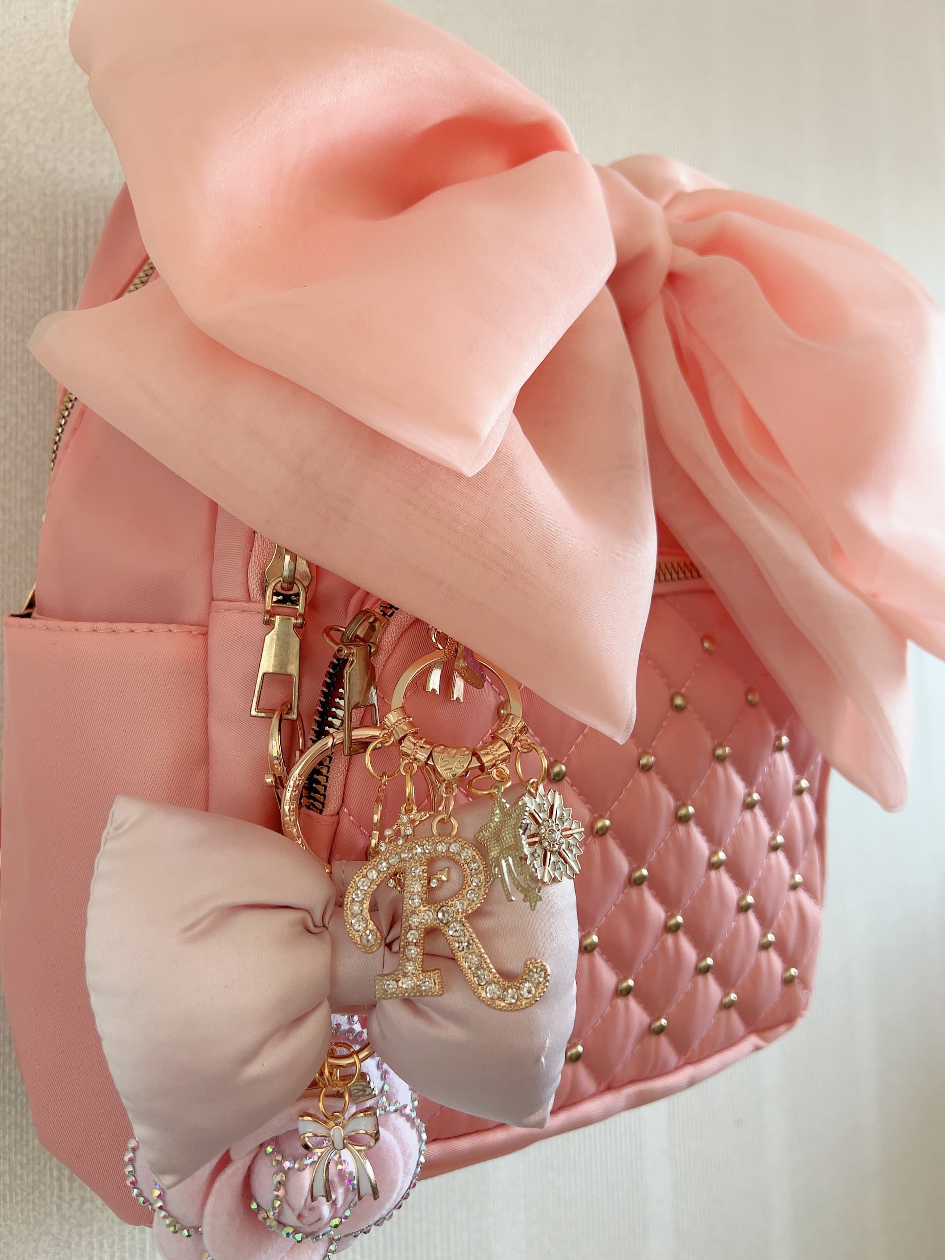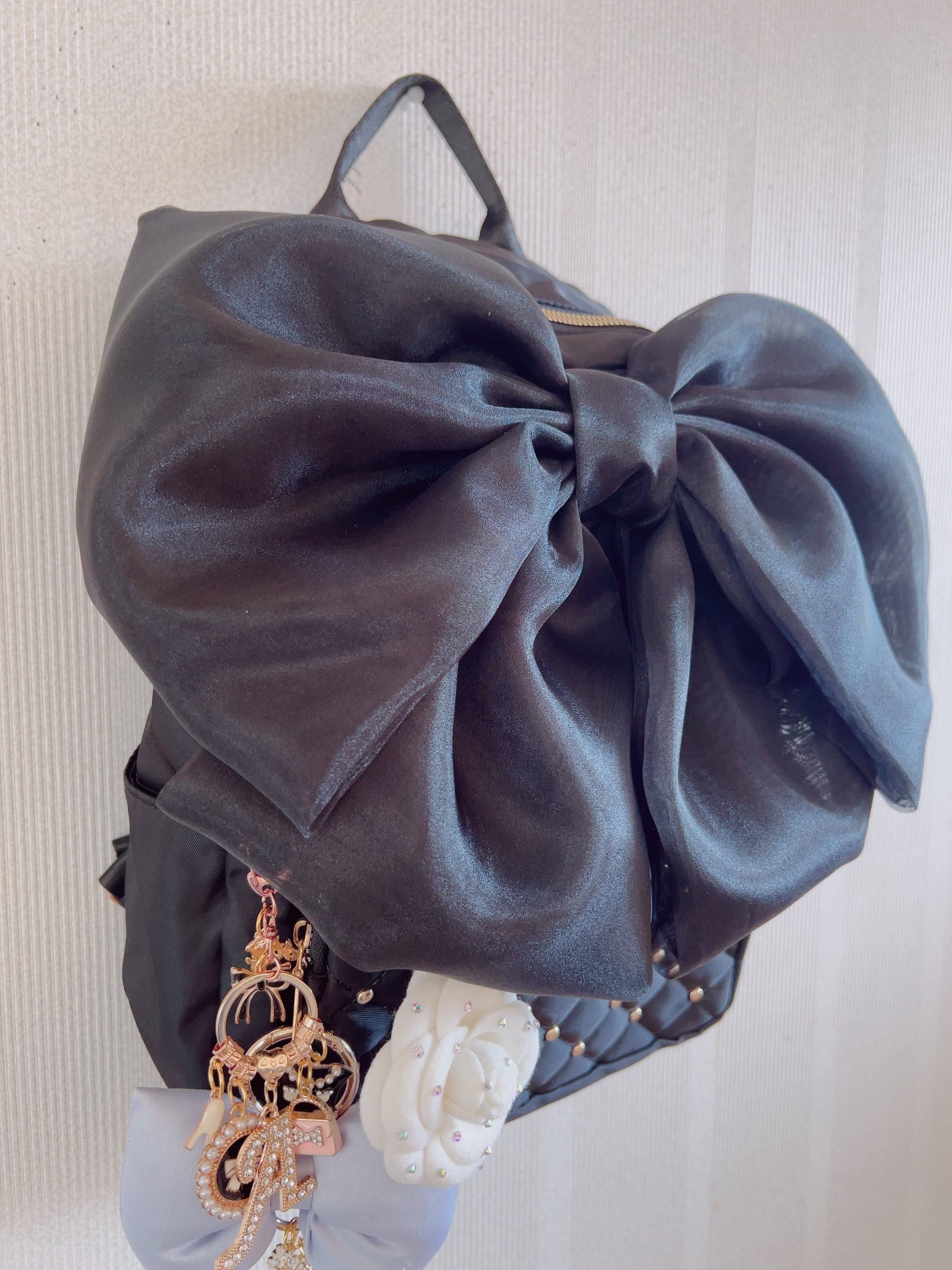 大きなおリボンがチャームポイントになっているため「甘すぎない?」と思われがちなバッグですが、キルティングポケットのゴールドスタッズが何とも言えないバランスをとって可愛すぎない、甘めかし過ぎないエイジレスリュックを実現♪☆
