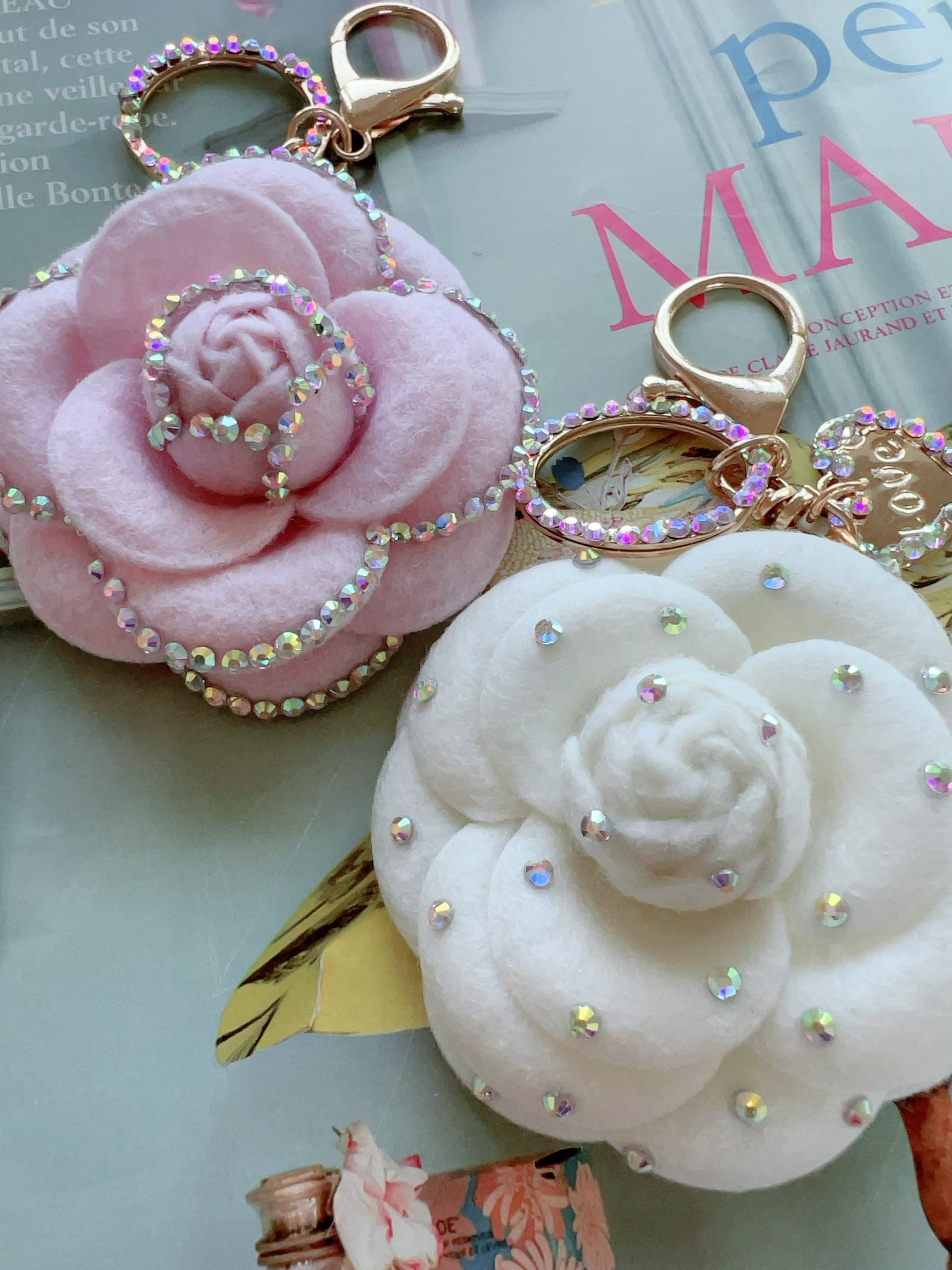 大きなカメリアに、キラキララインストーンを散りばめてくださり、「わたしだけのカメリア」を完成させていただきます。バッグチャームとしてだけでなく、バッグから取り外してキーホルダーとしてもお使いいただけます。