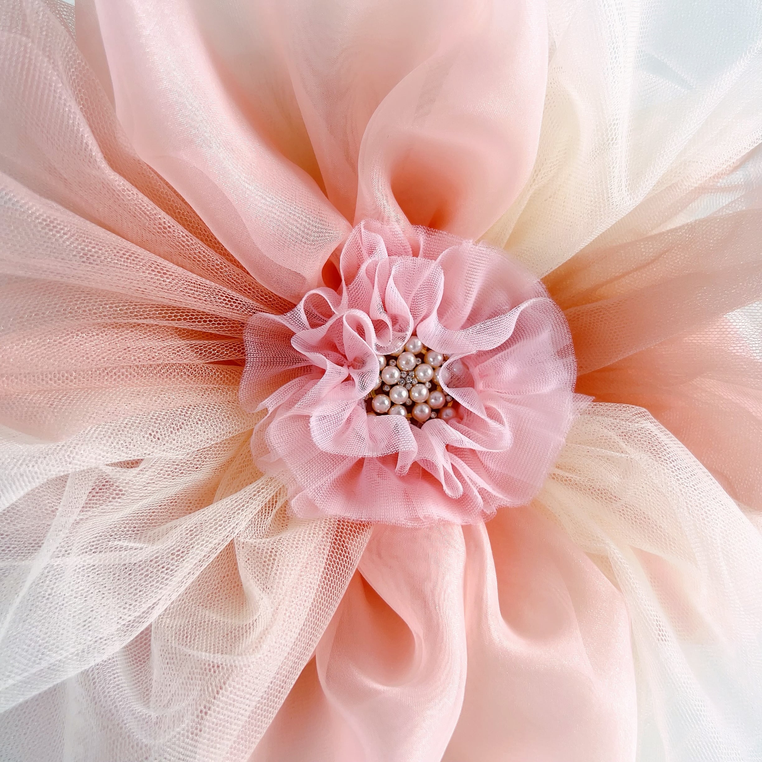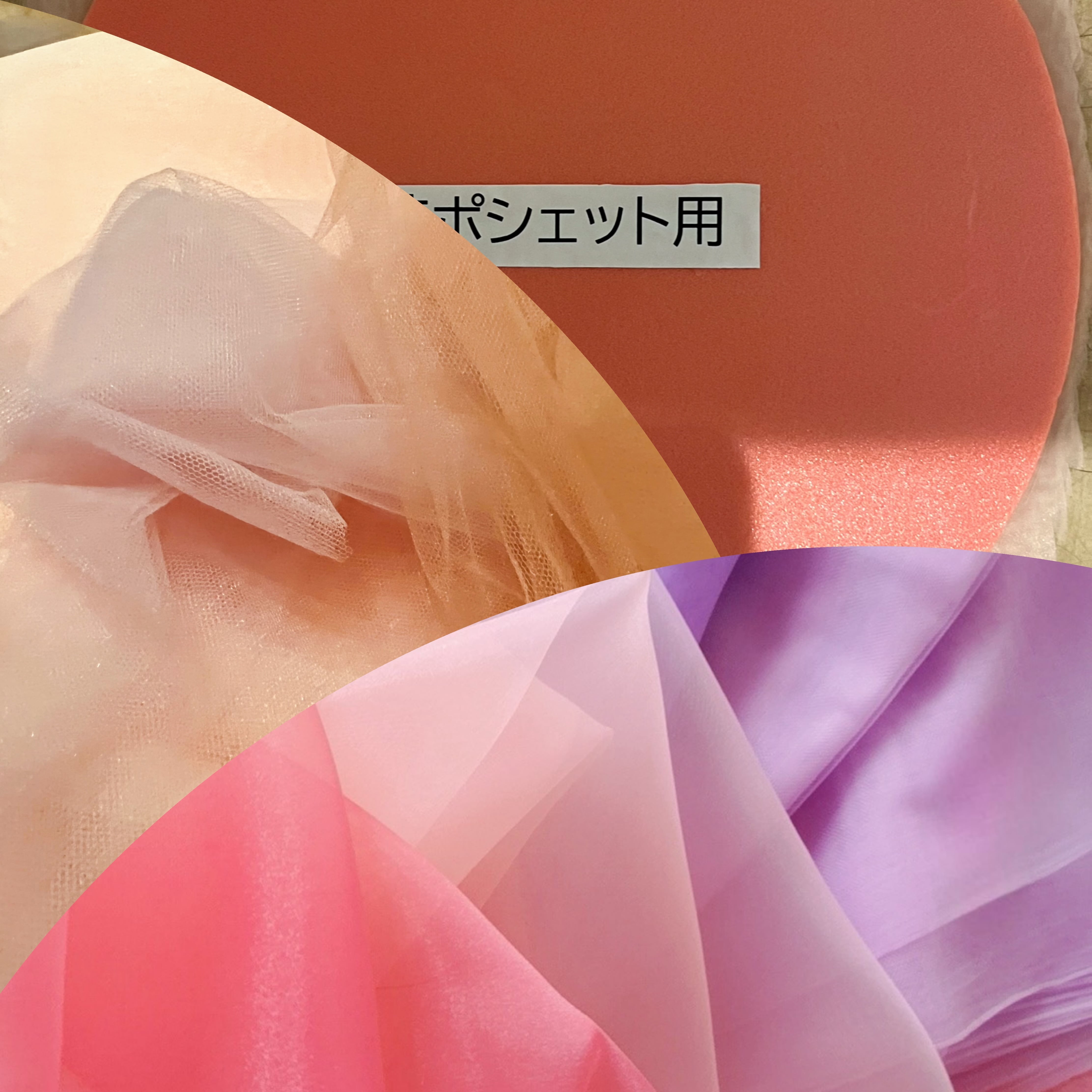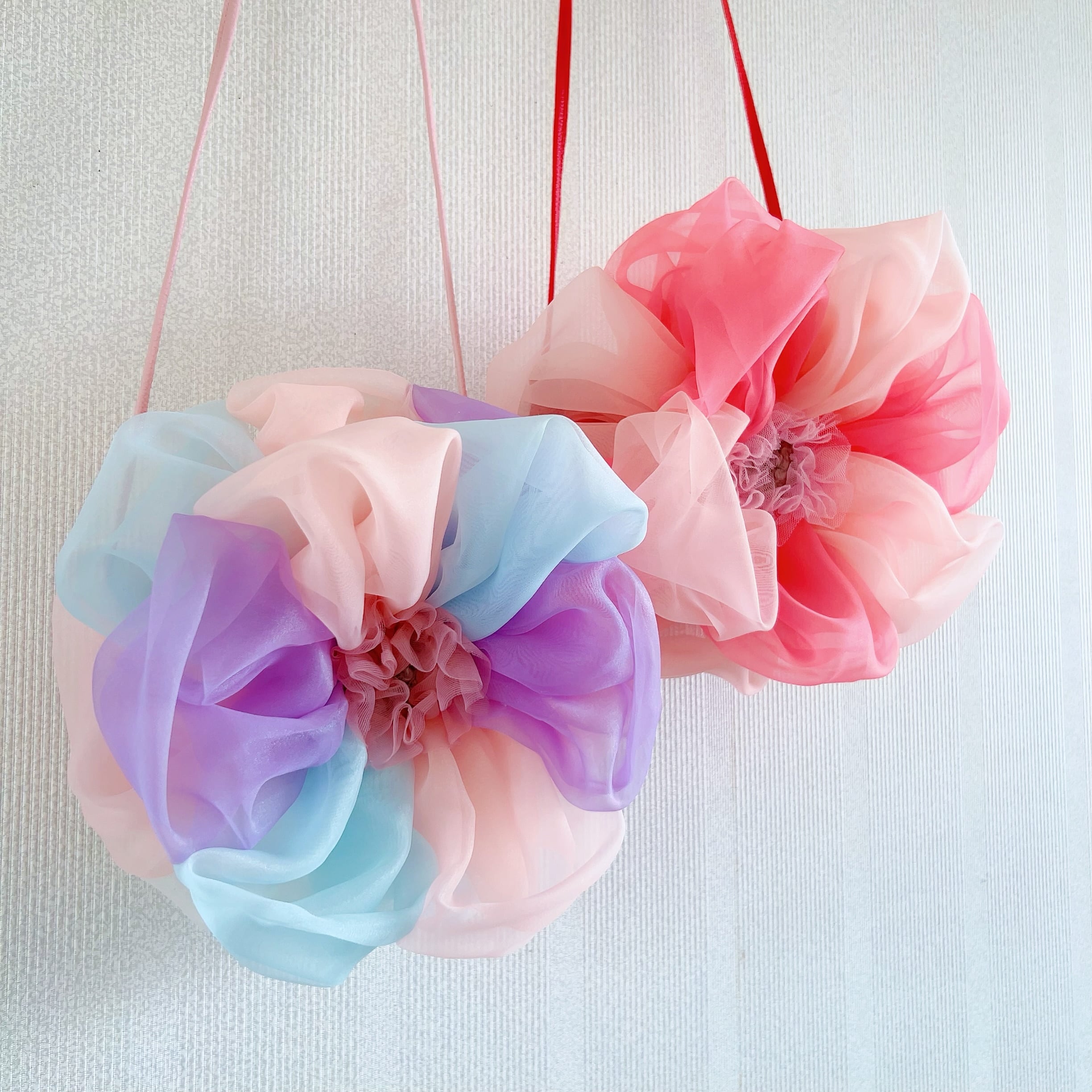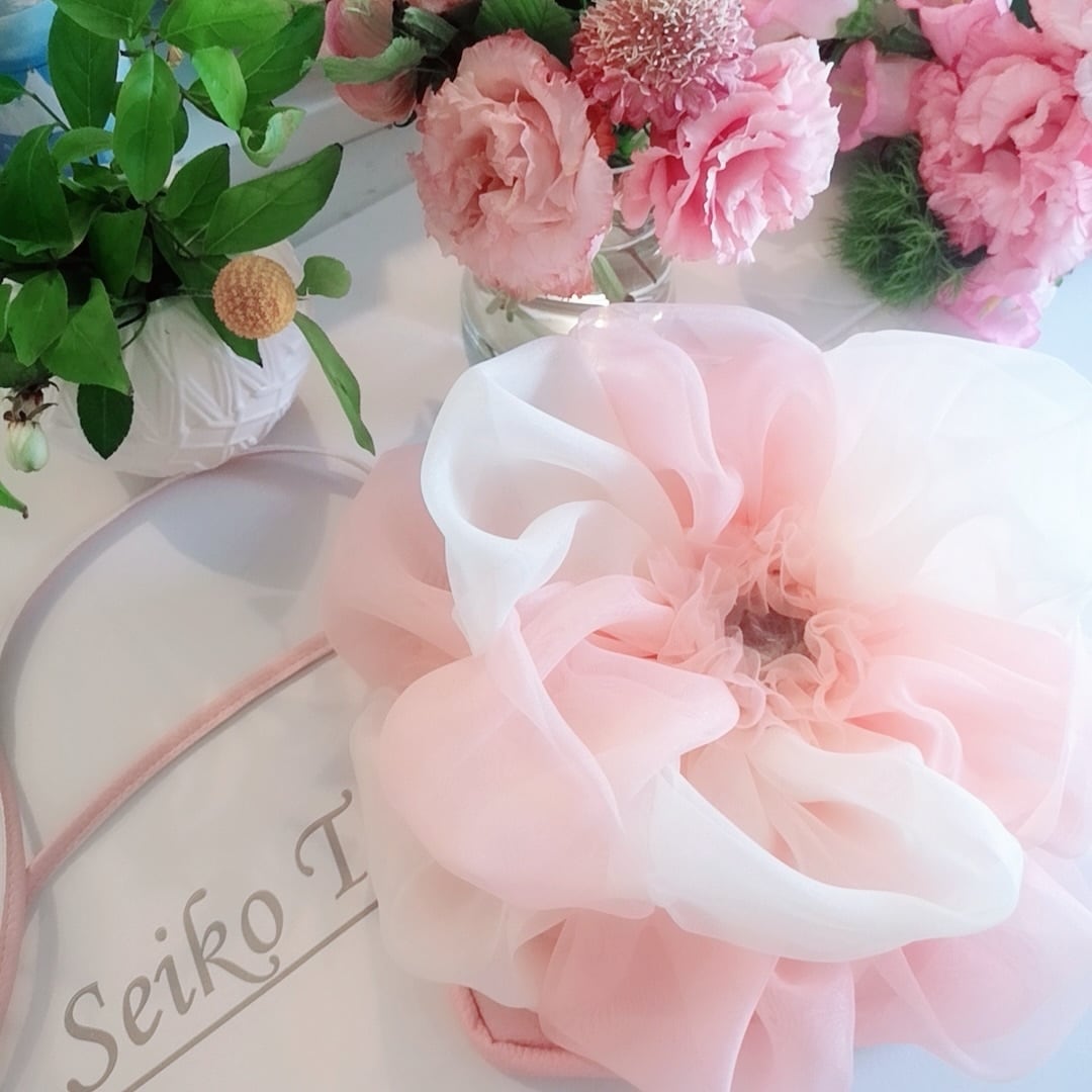 フェイクレザーのポシェット本体に、オーガンジーやシフォンチュールの花びらでつくったふわふわのお花がプットオンされたお花ポシェットワークショップ