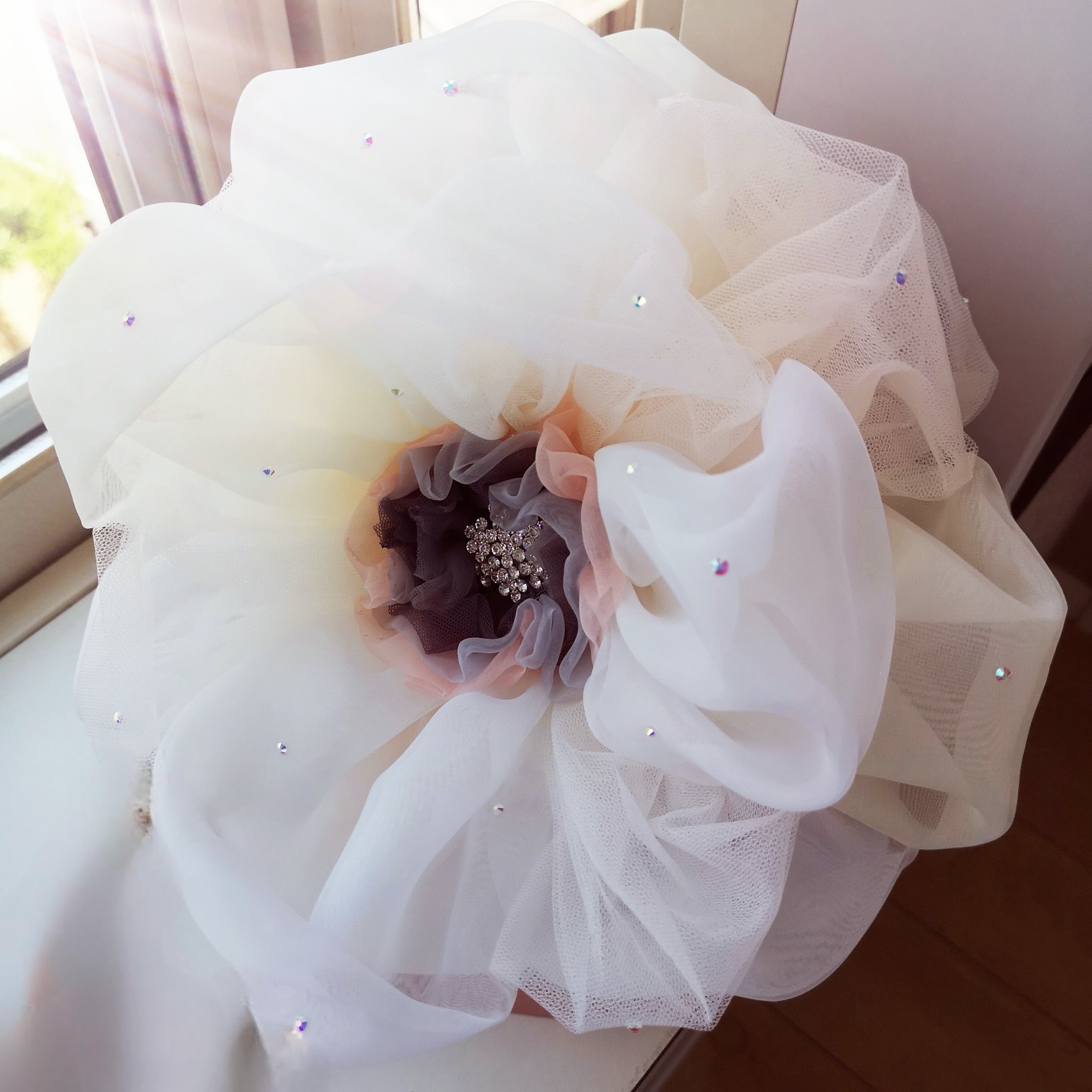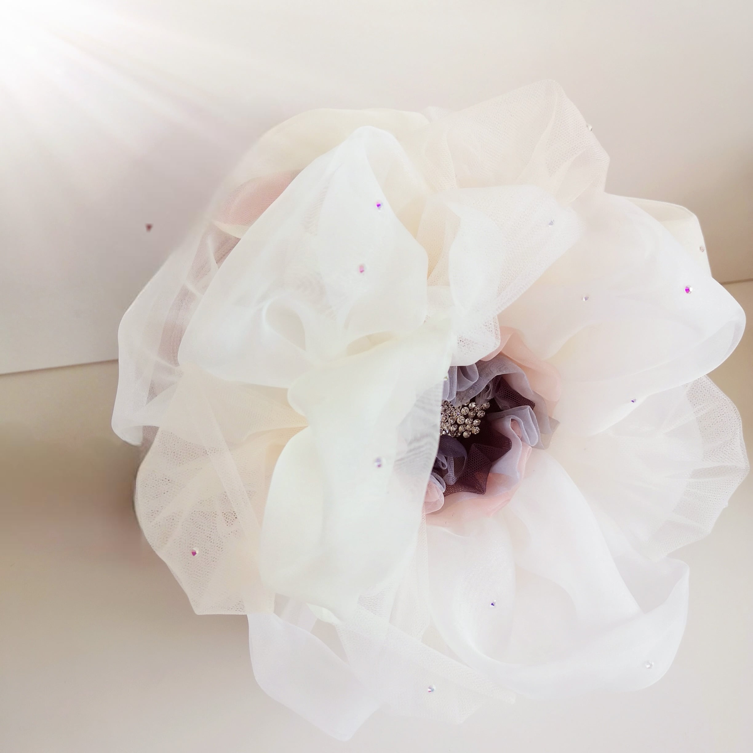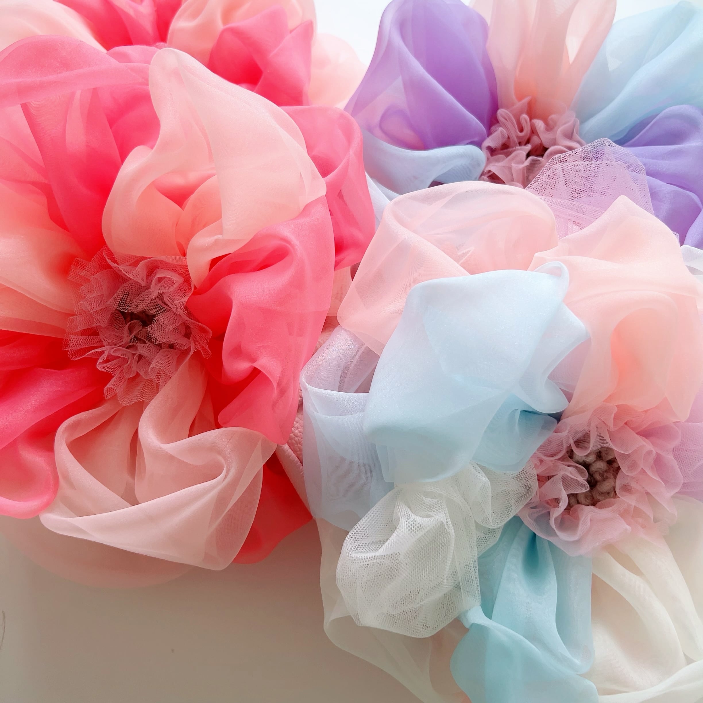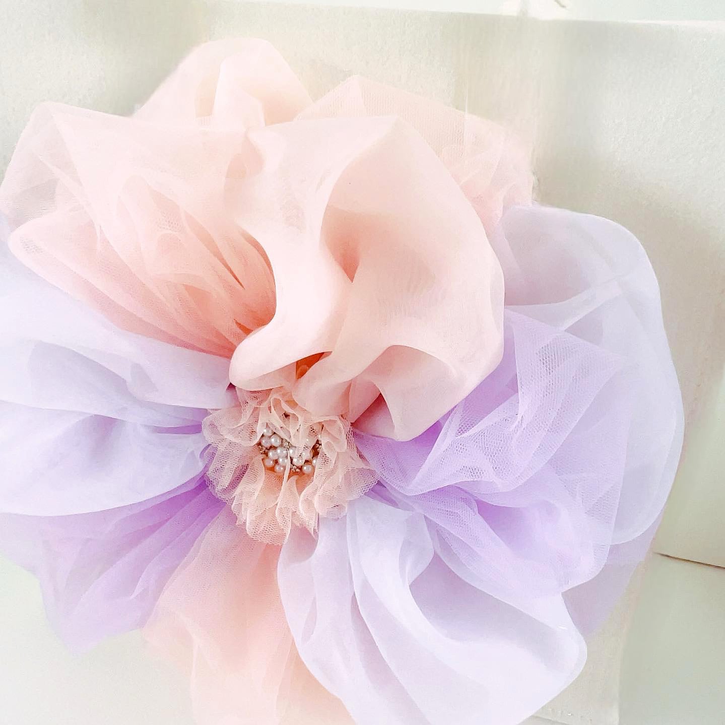 フェイクレザーのポシェット本体に、オーガンジーやシフォンチュールの花びらでつくったふわふわのお花がプットオンされたお花ポシェットワークショップ