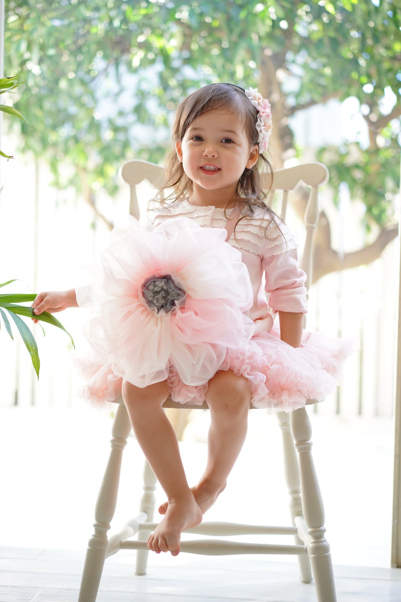 ふわふわの大きなお花を装って街なかを歩くお花の妖精さん