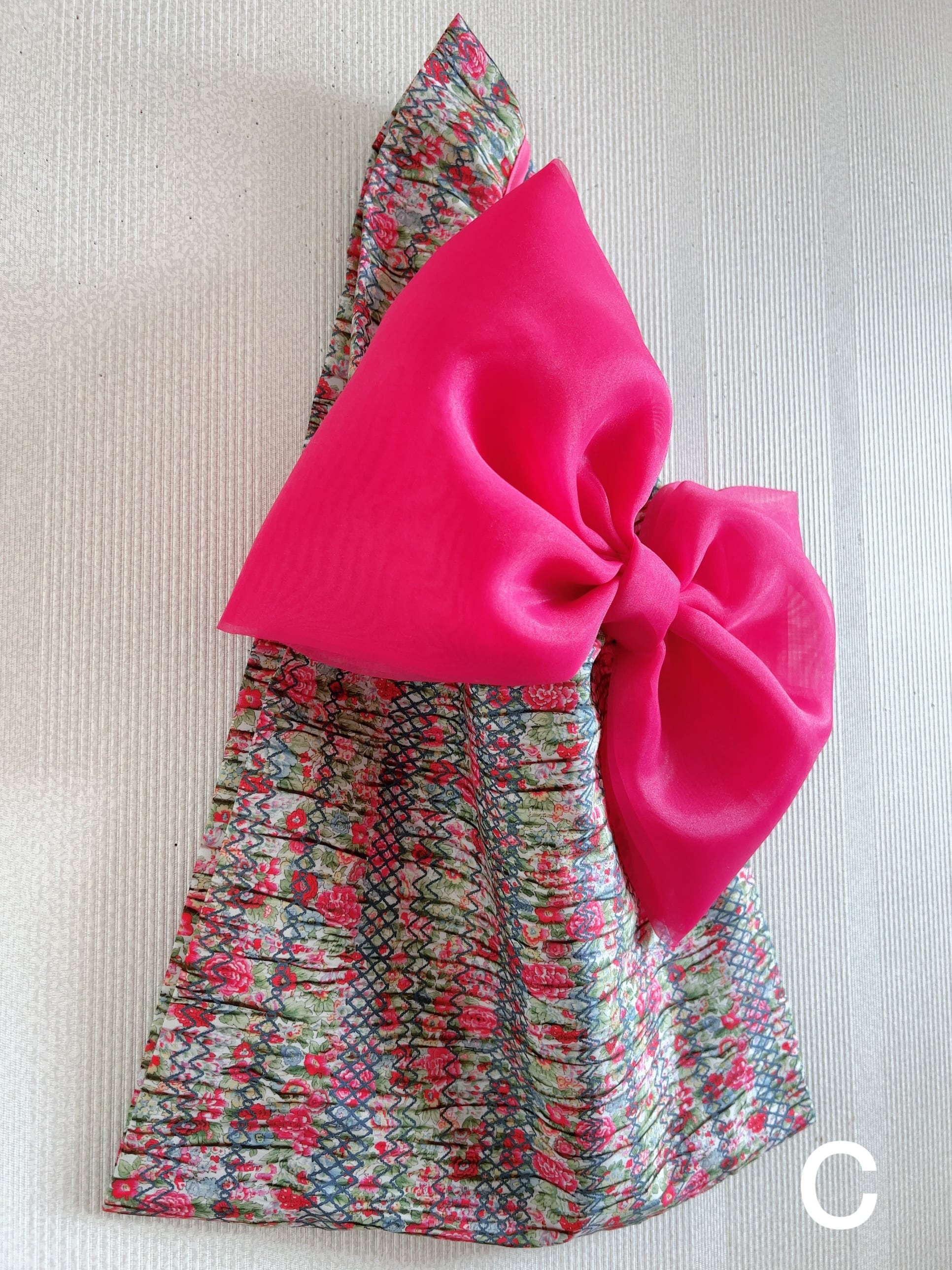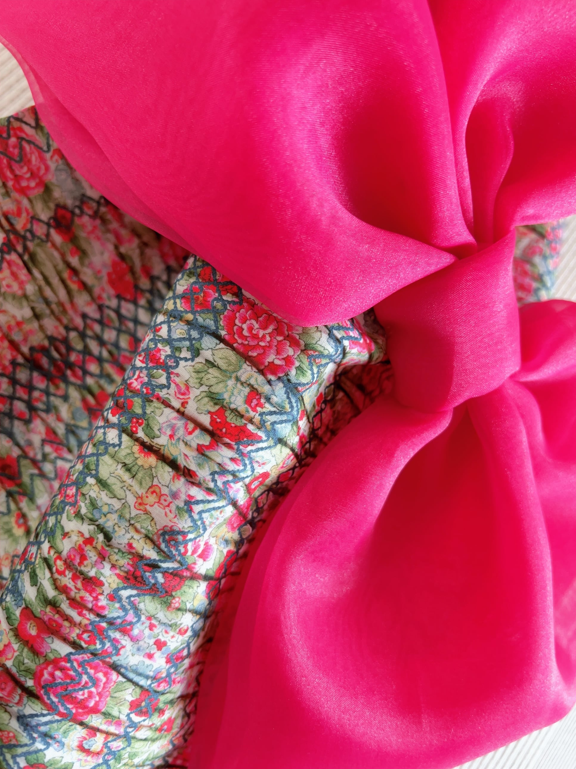 繊細な菱形のステッチが質感のあるプリーツとひだを作り出し、美しくノスタルジックな花柄の生地がまるで洋服の形にまとめられているような錯覚が起こります。
