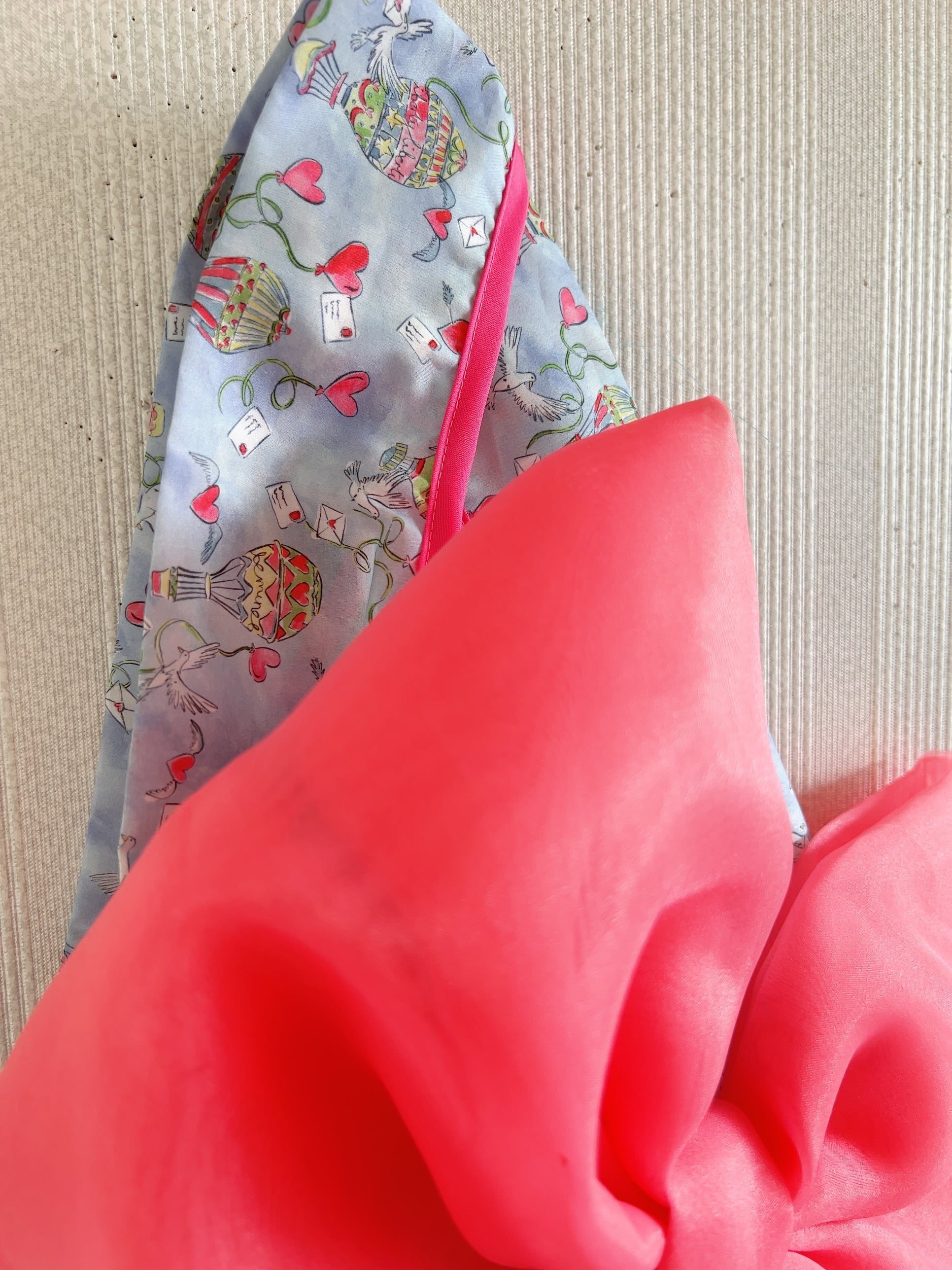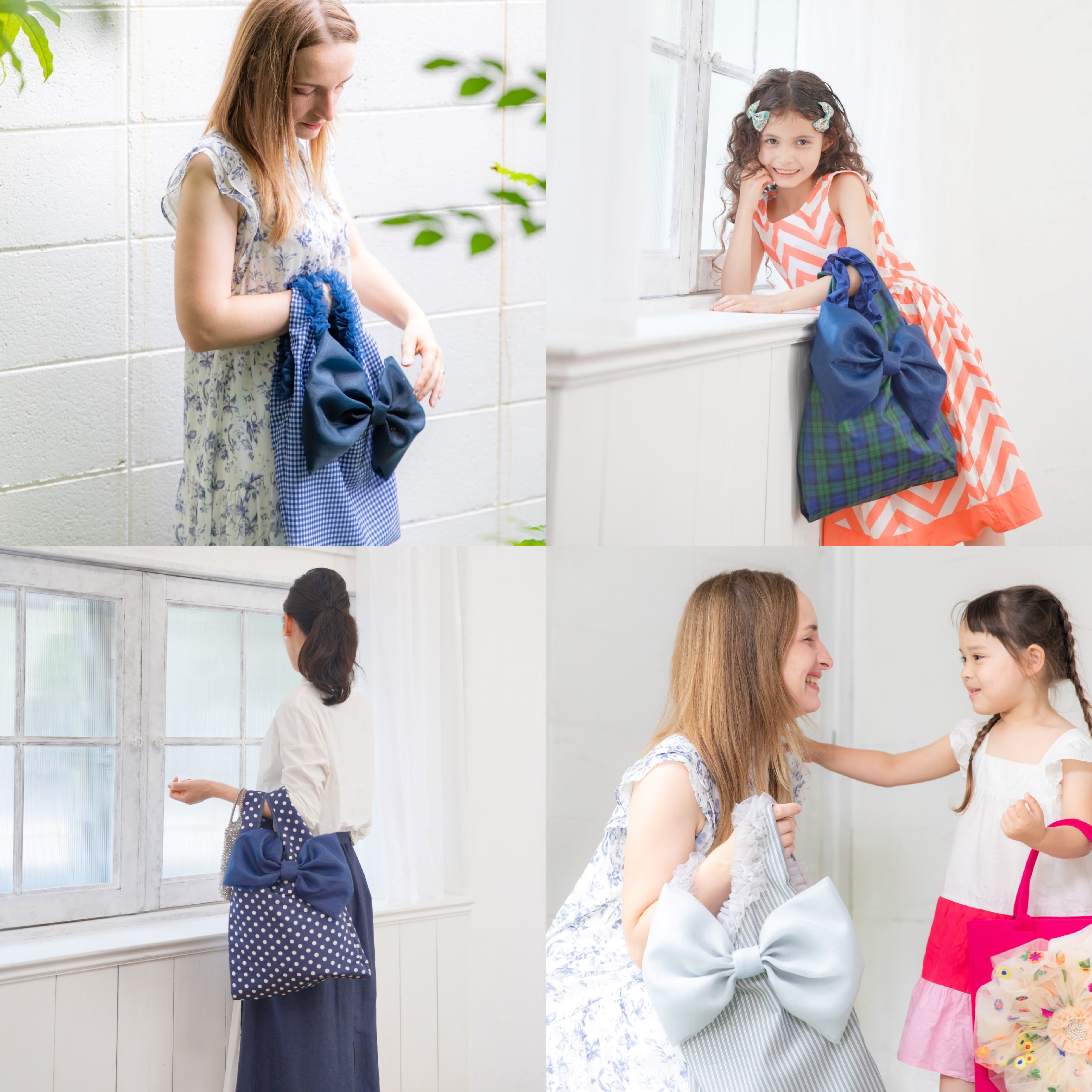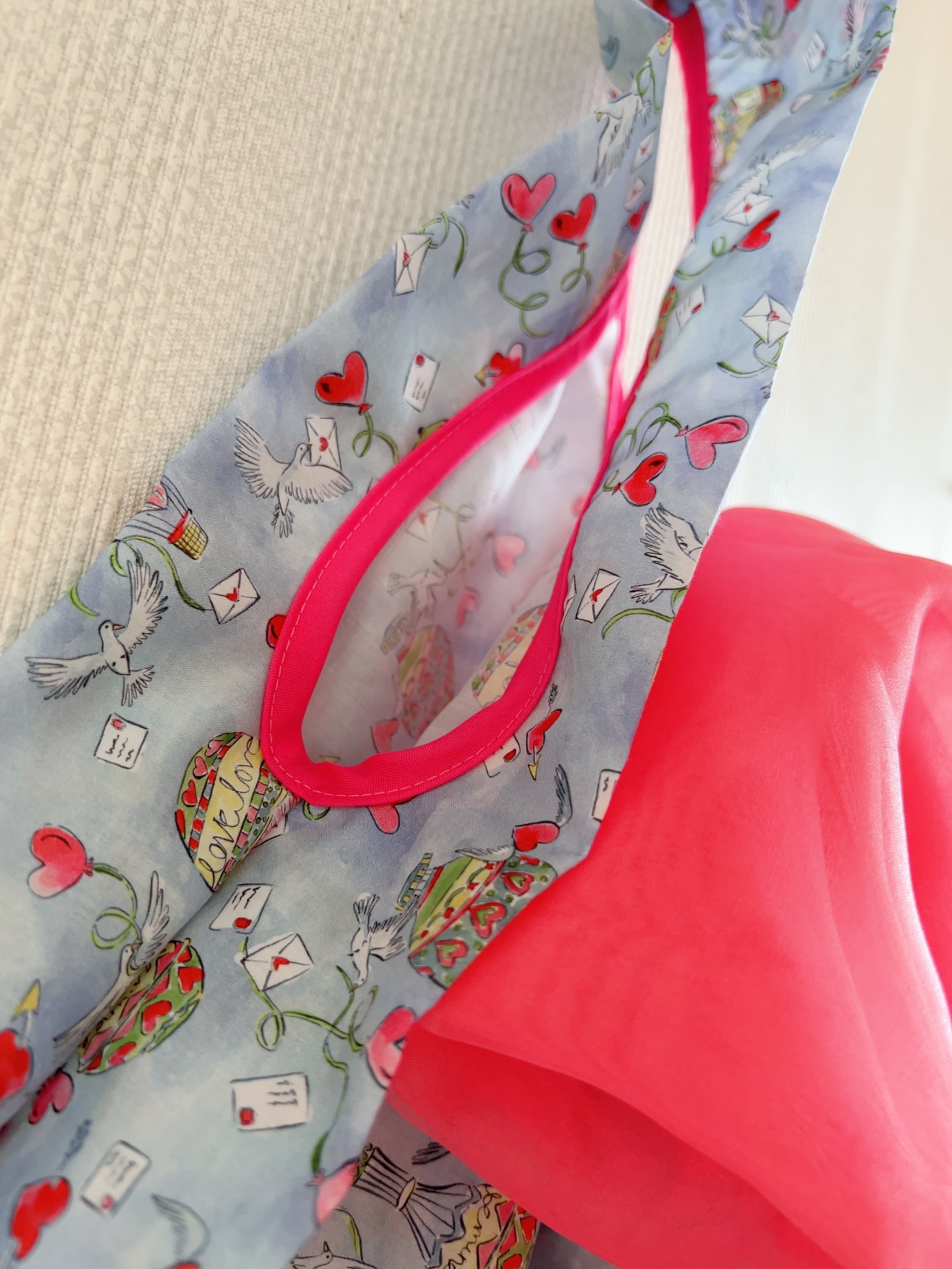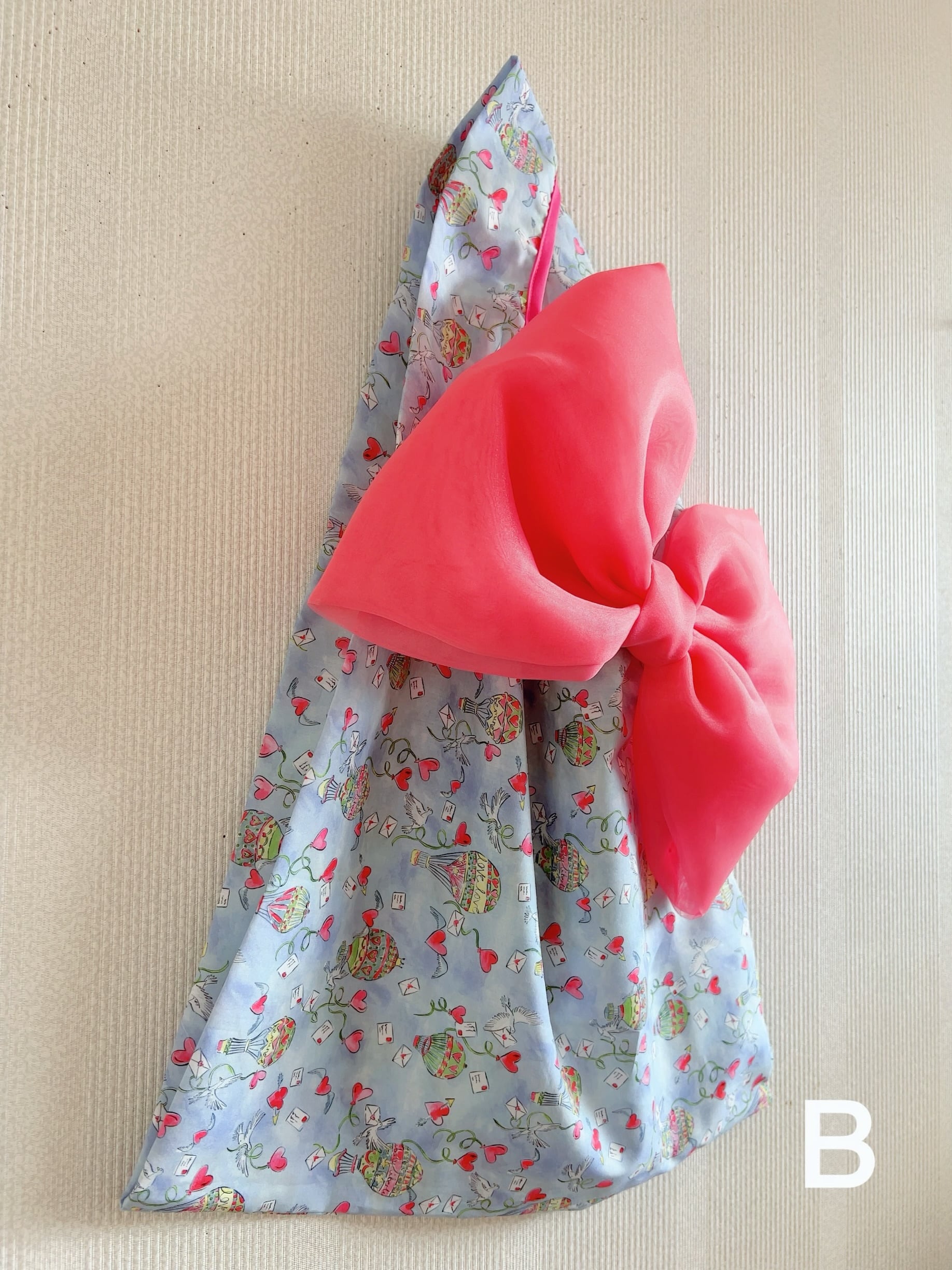 レッドピンクのリボンと合わせるととびきりチャーミングなリボンバッグに仕上がりました。