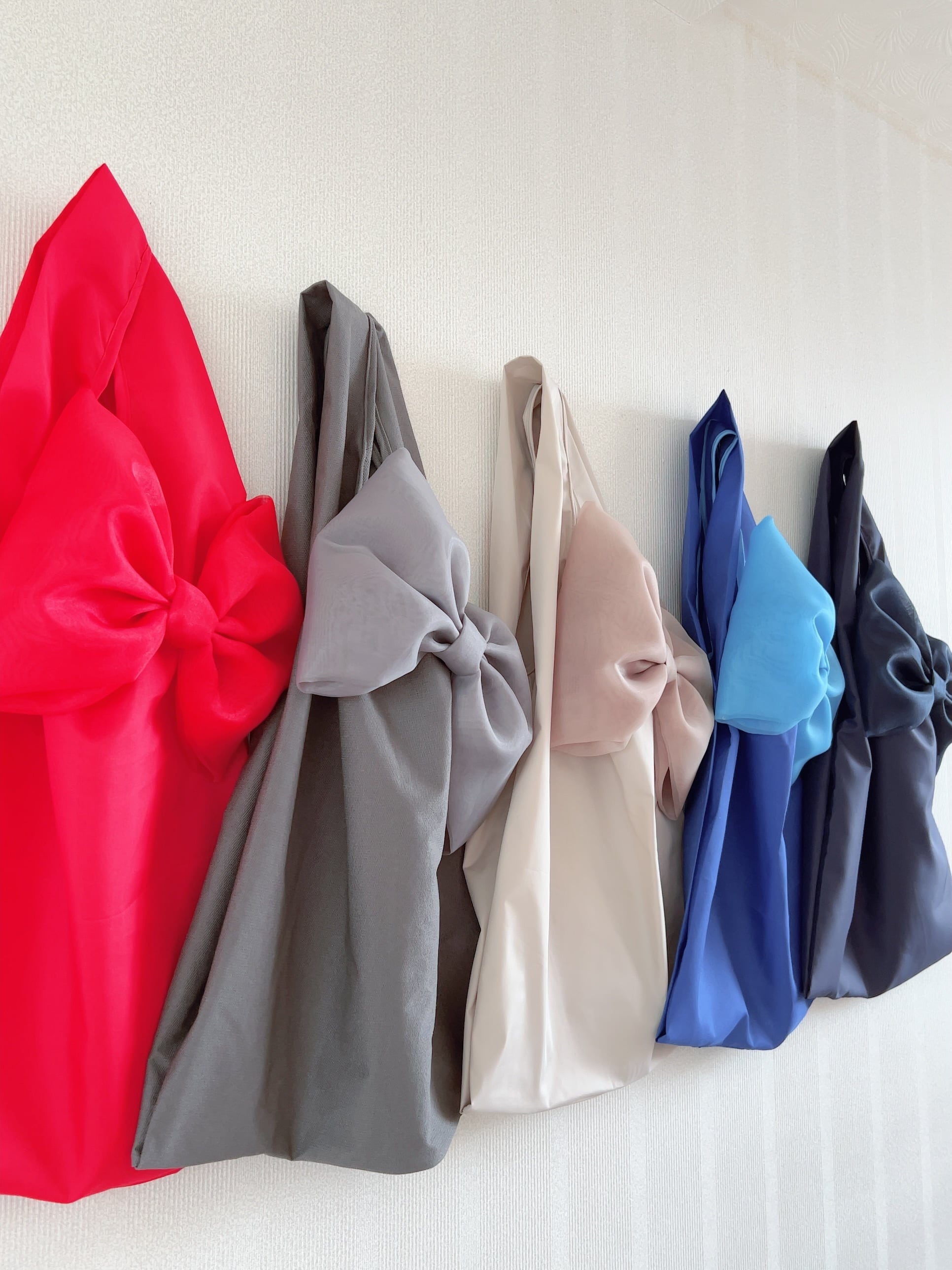 ※画像の 立ち姿のモデル着用はグレー、赤ちゃんを抱っこして後ろ姿のモデル着用はネイビーのショッピングリボンバッグとなっております。
