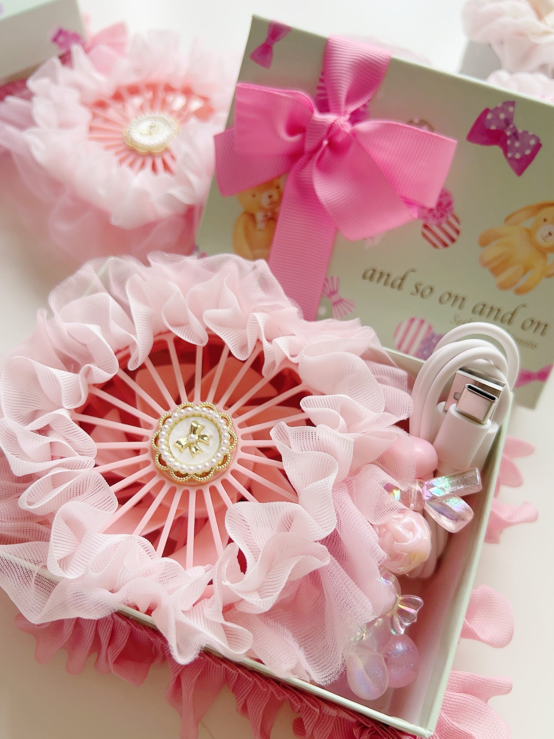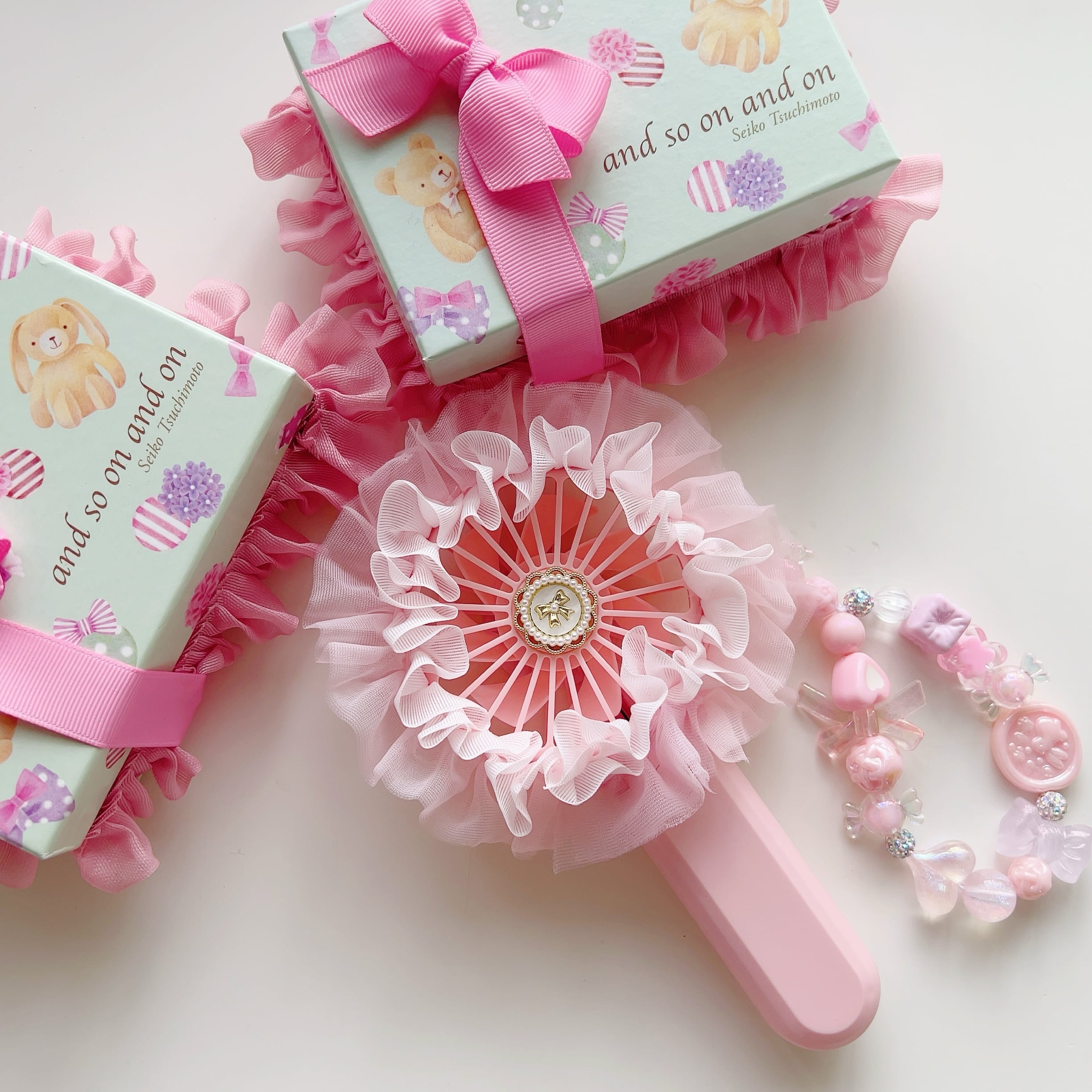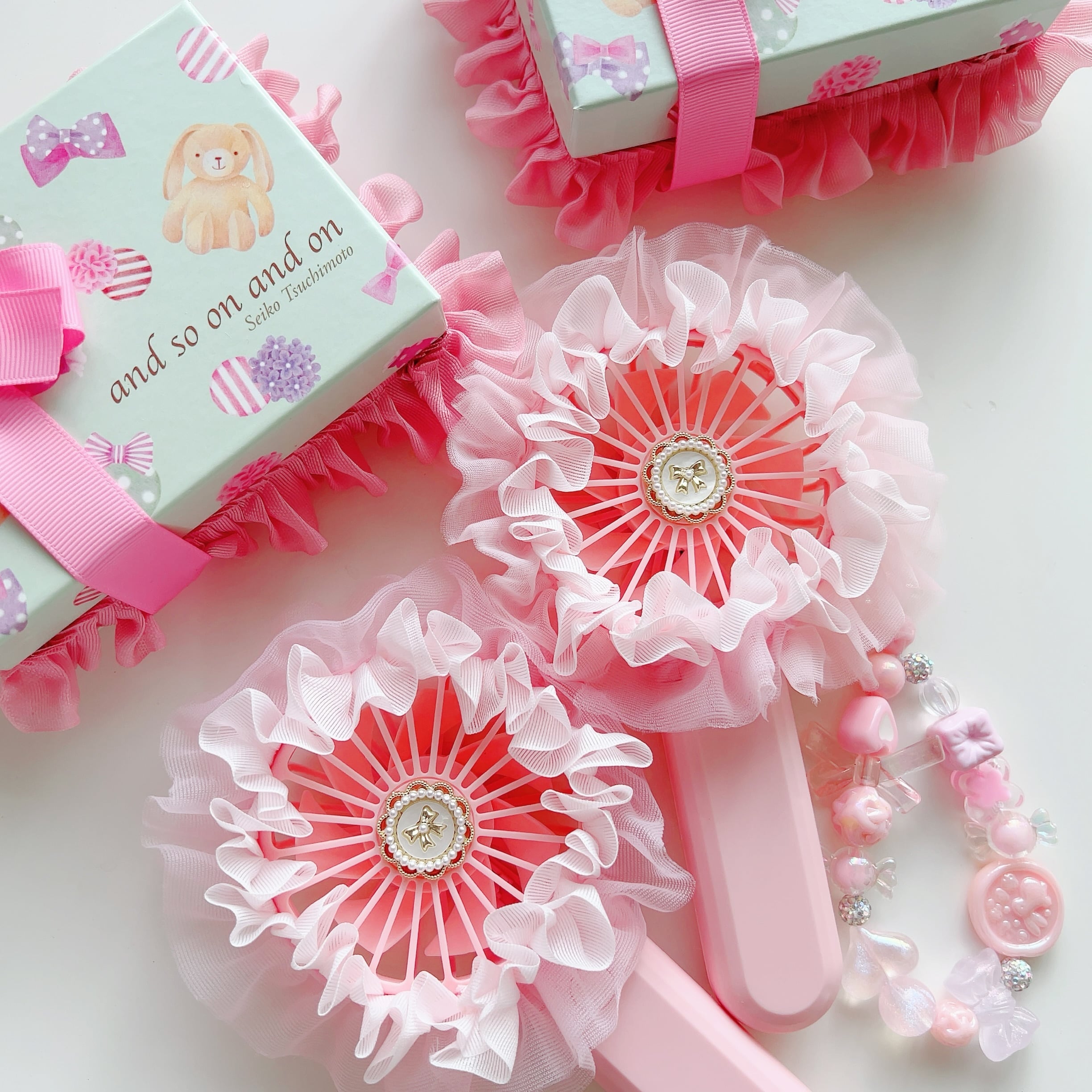 SEIKOデザインのハンディファンは、ふわふわフリルとキラキラビジュー